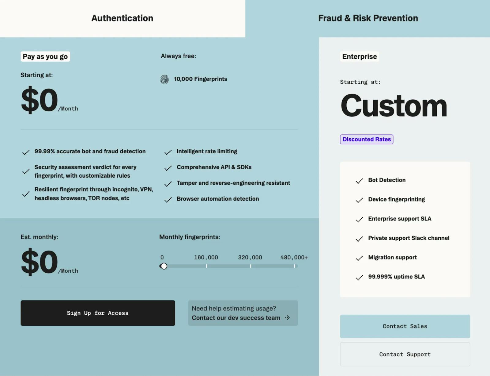 For Fraud & Risk Prevention, Stytch’s pricing also scales with the number of users, with $0/month when there are less than 10K monthly fingerprints. Beyond that, fingerprints are $0.005 each (or $5 for 1K fingerprints).