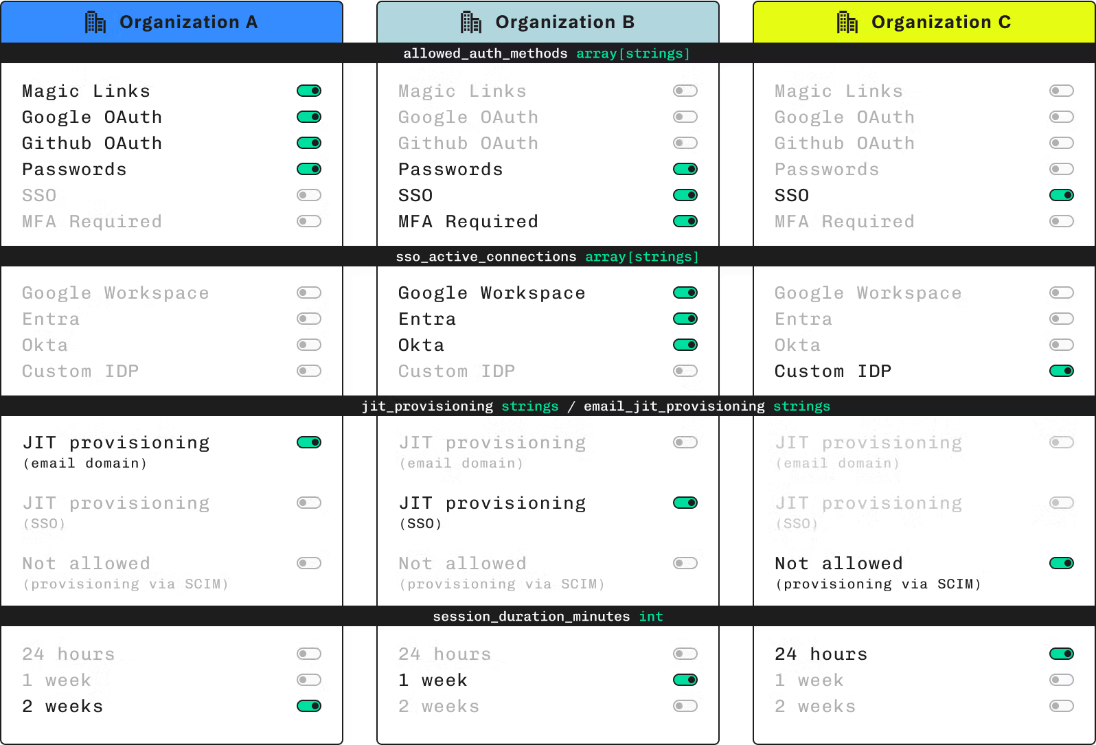 Stytch’s organization authentication settings solution allows organizations to manage multi-tenant requirements related to memberships, self-serve or enterprise onboarding, and organization-wide settings.