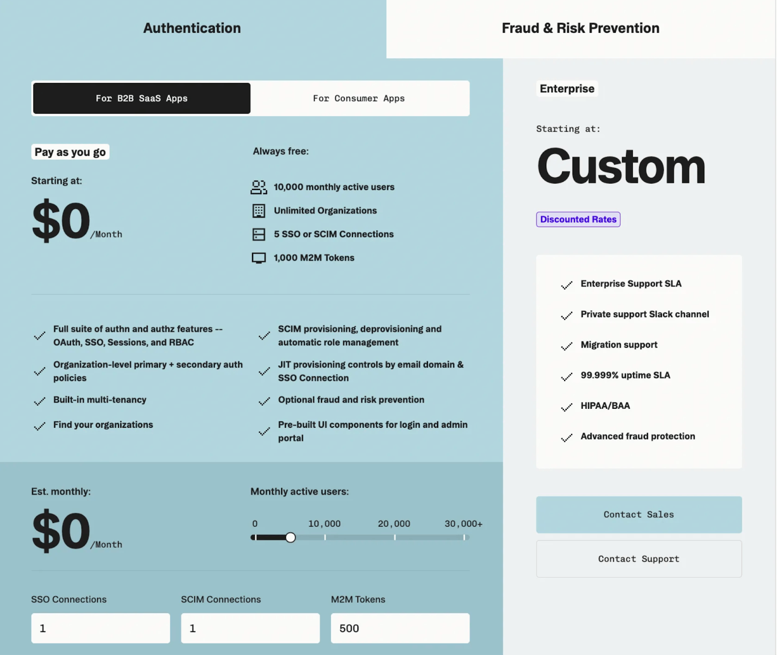 Stytch has pay-as-you-go pricing that scales with the number of users their client is trying to authenticate, starting at $0/month when there are fewer than 10K monthly active users for both B2B SaaS Apps and Consumer Apps. This includes its full suite of authentication and authorization features such as OAuth, SSO, Sessions, and Role Based Access Control. From there, Stytch’s pricing includes optional add-ons such as a customizable brand and login experience for $99, additional SSO or SCIM connections beyond the included 5 for $125/connection, and a wide range of fraud and risk prevention features such as CAPTCHA, bot detection and prevention, device fingerprinting and intelligent rate limiting.