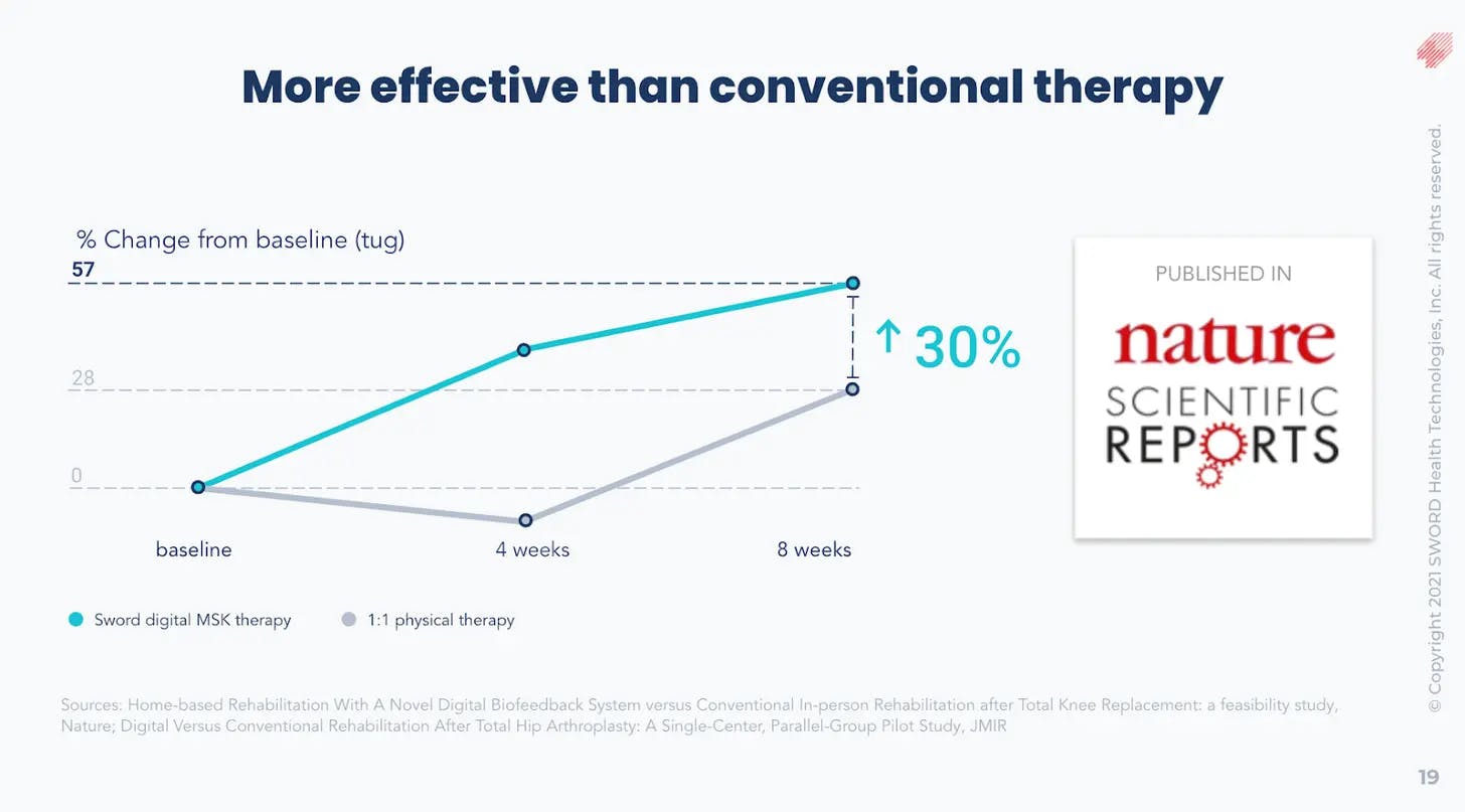 Sword Health is a digital health company offering virtual physical therapy for MSK care. Its mission is to free 2 billion people from pain. Sword Health serves employers and health plans to help their employees and members achieve clinically significant health outcomes for MSK conditions. Sword Health’s platform combines interaction and feedback from physical therapists with its AI monitoring and feedback tool to create personalized, at-home treatment plans for its patients to improve adherence and outcomes.