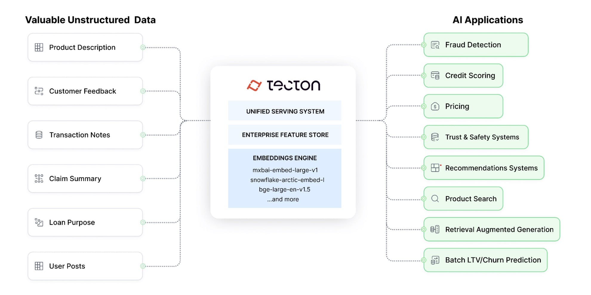 One of the key technical innovations in Tecton's embedding service is its ability to incrementally update embedding as source data changes. This feature ensures that vector representations always reflect the latest information without requiring full recomputation of the entire embedding space. This approach significantly reduces computational overhead and ensures that AI applications always have access to the most up-to-date representations of their data.