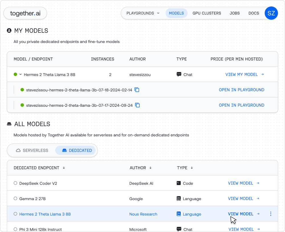 Together AI provides the user interface for an end-to-end developer experience. As of 2024, it boasts cheaper endpoints compared to industry incumbent OpenAI. In general, its infrastructure can scale at lower prices than what’s offered by traditional hyperscalers, with users paying 1/5th of the traditional cost to train and fine-tune models. As a cloud-agnostic solution, it also serves users who want to avoid being locked into a cloud service. A key differentiator lies in its open-source mission. By providing customers access to over 100 open models and spearheading research on its own, it appeals to the open-source community.