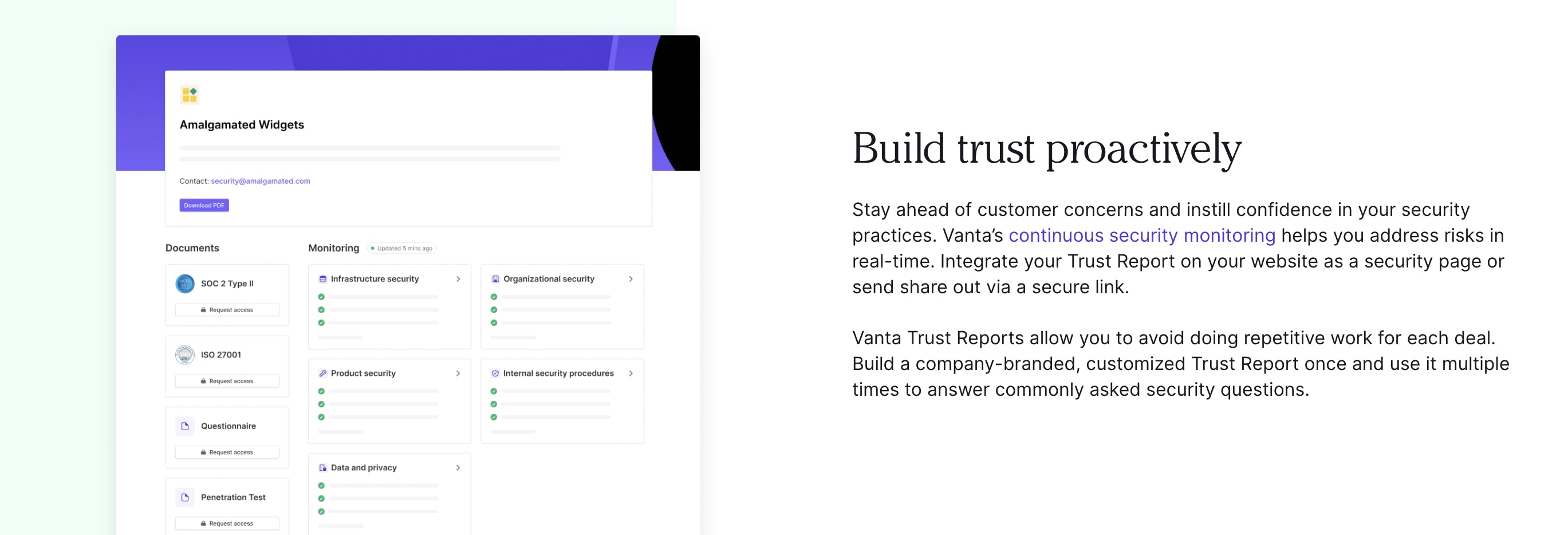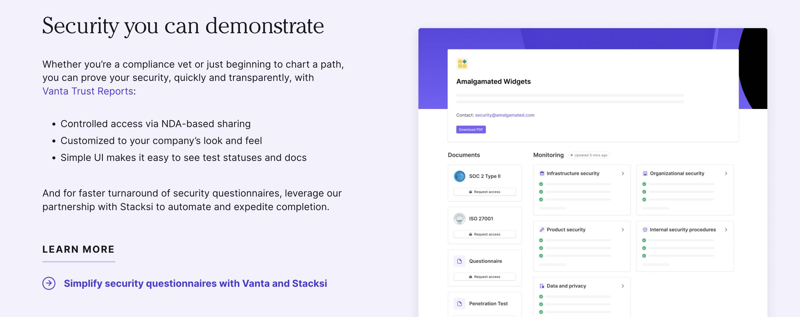Vanta Trust Reports is designed to allow companies to build trust with customers by demonstrating a commitment to security through transparent reporting. The product is intended to streamline security reviews and shorten sales cycles by making it easier for companies to produce customizable, real-time, shareable reports through an automated NDA process. Vanta Trust Reports communicate security information in a dashboard alongside commonly requested security documents and certifications.