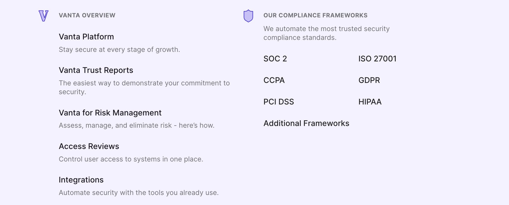 Vanta helps companies strengthen their security with compliance automation software and has 4 products: Vanta Platform, Vanta Trust Reports, Vanta for Risk Management, Access Reviews and includes a plethora of compliance frameworks and integrations.