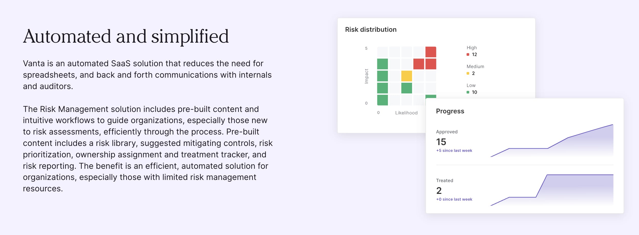 Vanta’s Risk Management tool is built to simplify and automate the process of assessing risk and optimize workflows so that they more quickly and effectively identify and reduce risk on a continuous basis. The Vanta for Risk Management tool is based on the ISO 27005 risk assessment guidelines which capture the industry’s best practices. It includes pre-built content and workflow round risk library, risk prioritization calculations, mitigation controls, mitigation tracking, ownership assignment, and risk reporting.