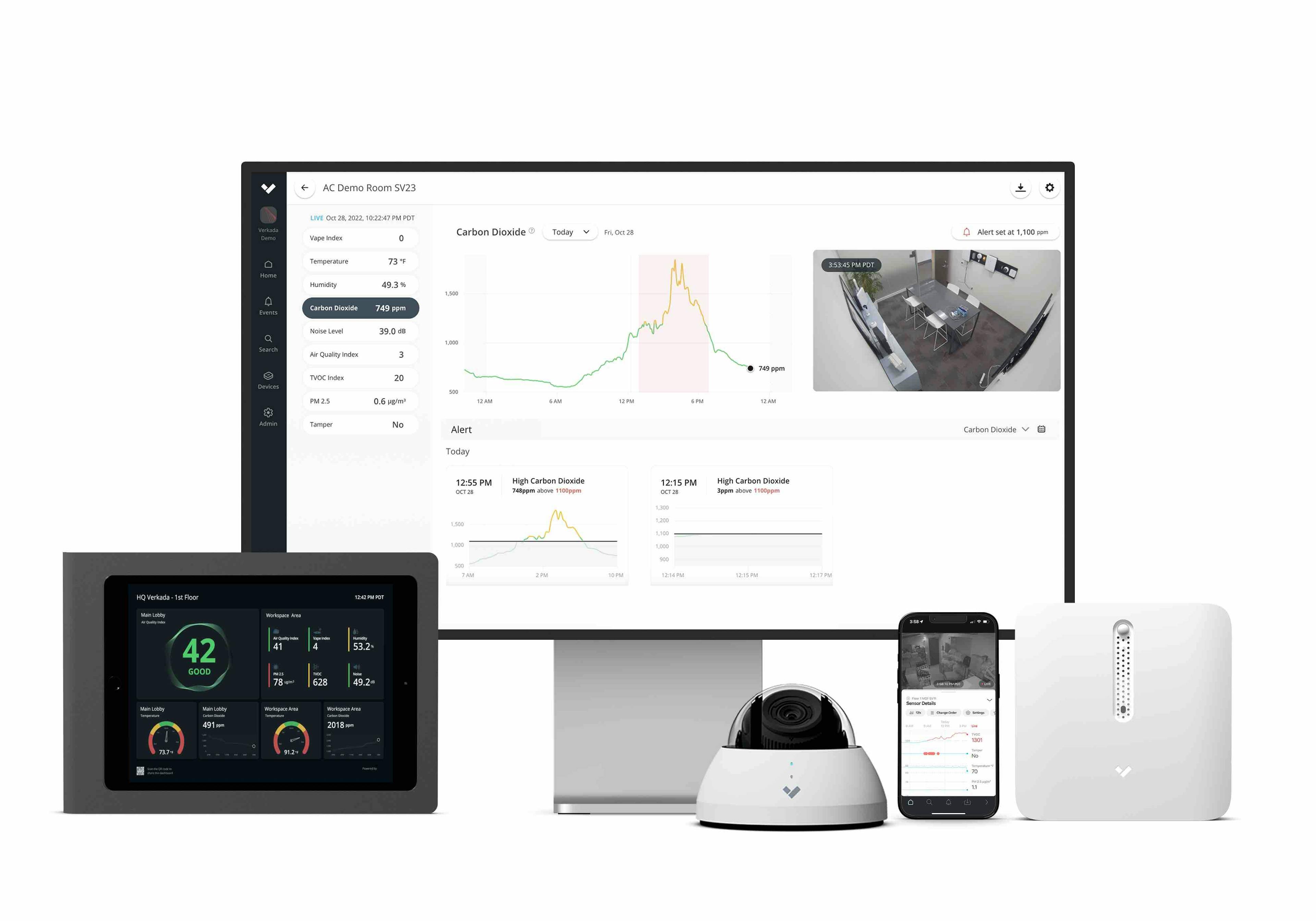 Verkada's Air Quality product is an IoT-enabled environmental sensor designed to monitor and analyze indoor air quality in real time. The sensor integrates with Verkada's existing products and Command platform, offering a unified platform for facility management. Data collected by the air quality sensors is stored and analyzed in the cloud, allowing administrators to access historical trends, receive alerts on potential issues, and remotely manage the devices from any internet-connected device.