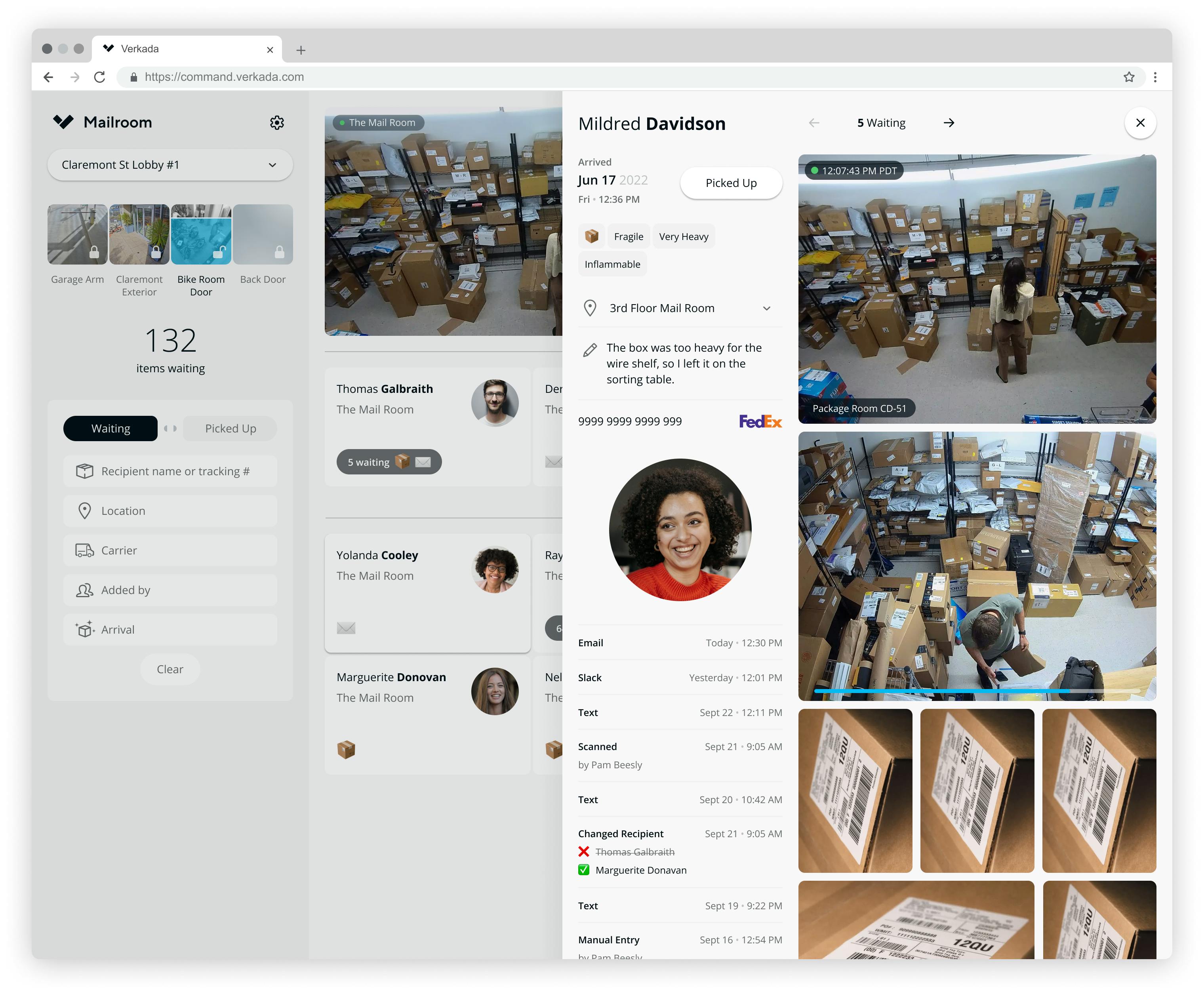 Verkada Mailroom is a package tracking and delivery management solution that helps organizations handle incoming packages and mail. After scanning a package label with the Verkada Mailroom app, the app sends notifications to the intended recipients and secures the package until pickup by working with Verkada’s video security products.