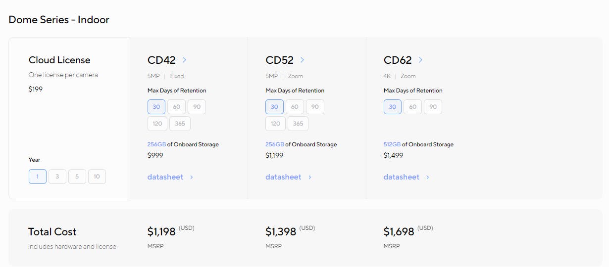 Verkada offers estimates of the total cost of a subscription that varies according to the product selected.