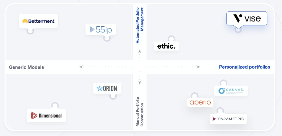 Vise* operates within this evolving market by providing financial advisors with an AI-powered platform that automates portfolio creation, management, and client communication. Unlike traditional investment vehicles such as ETFs, which offer broad market exposure through predefined products, Vise enables advisors to customize portfolios based on individual client preferences, risk tolerance, and tax considerations. By leveraging AI, Vise allows advisors to scale their business and deepen client relationships while delivering personalized portfolios at scale.