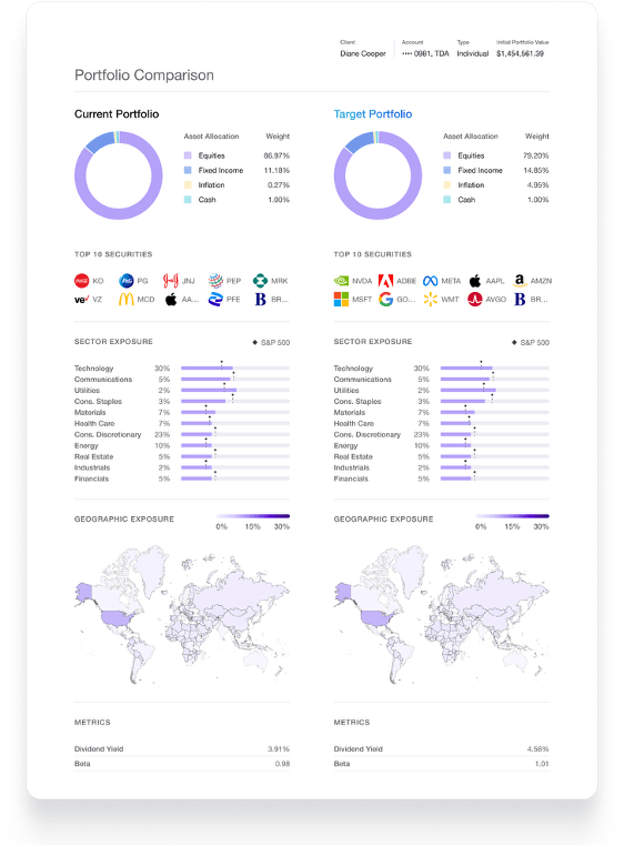 After incorporating all constraints, strategies, and preferences, Vise generates a fully customized portfolio tailored to the client’s current holdings, tax budget constraints, and investment preferences. The platform then produces a detailed Portfolio X-Ray (end-client transition report) that compares the existing portfolio with the proposed one, showing allocations, exposures, top holdings, sector breakdowns, tax savings, and transition turnover. This side-by-side comparison helps advisors present compelling proposals to prospects and clients.
