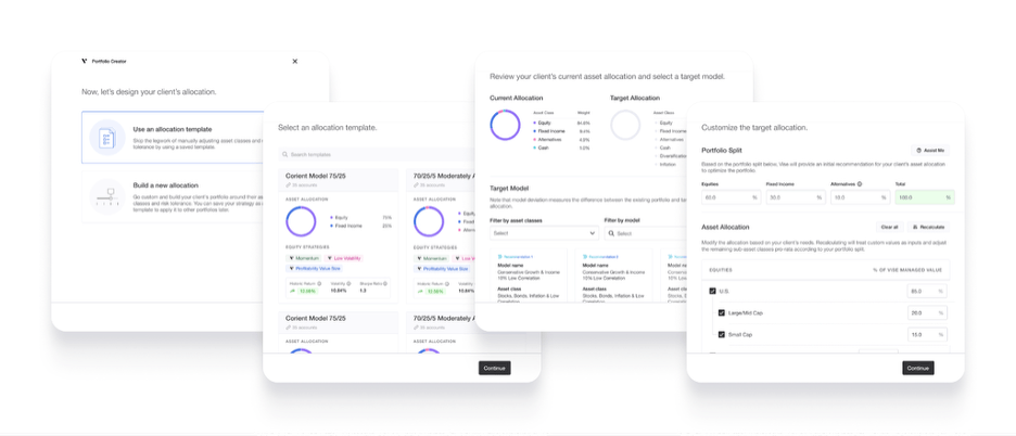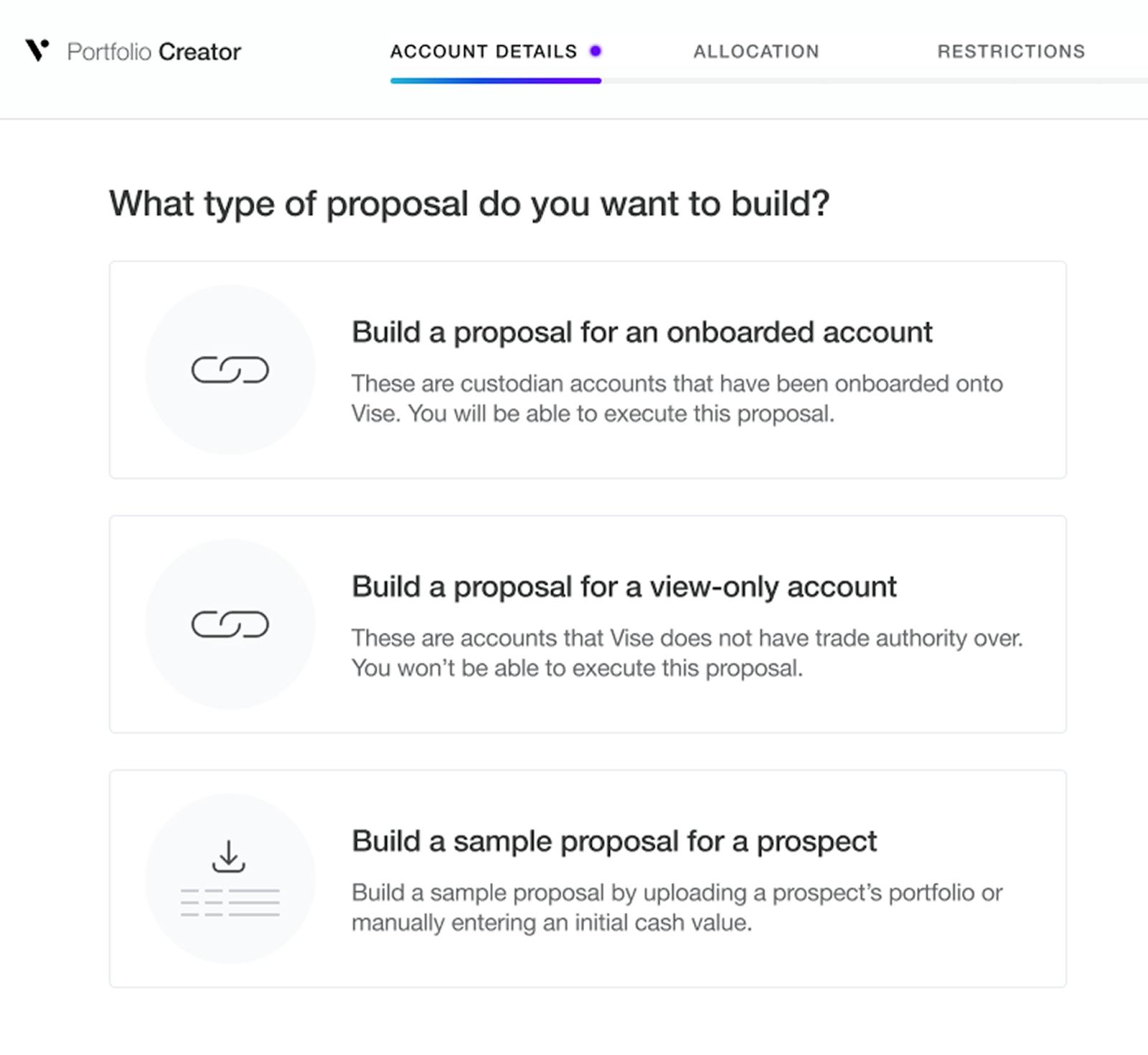 Vise’s portfolio creation process is designed to give financial advisors a high level of control, flexibility, and automation when constructing customized portfolios for their clients. The experience is centered around the Portfolio Creator, a construction workflow that enables advisors to build an end-to-end personalized portfolio for a client.