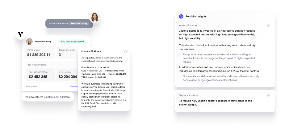 On the advisor-facing side, Vise integrates generative AI models to augment client engagement. These tools generate clear explanations and talking points about portfolio decisions, asset allocations, and market movements—helping advisors articulate insights, answer client questions, and strengthen trust. The AI generates breakdowns of portfolio changes and performance drivers in an accessible format, designed to help advisors deepen relationships and win new business.