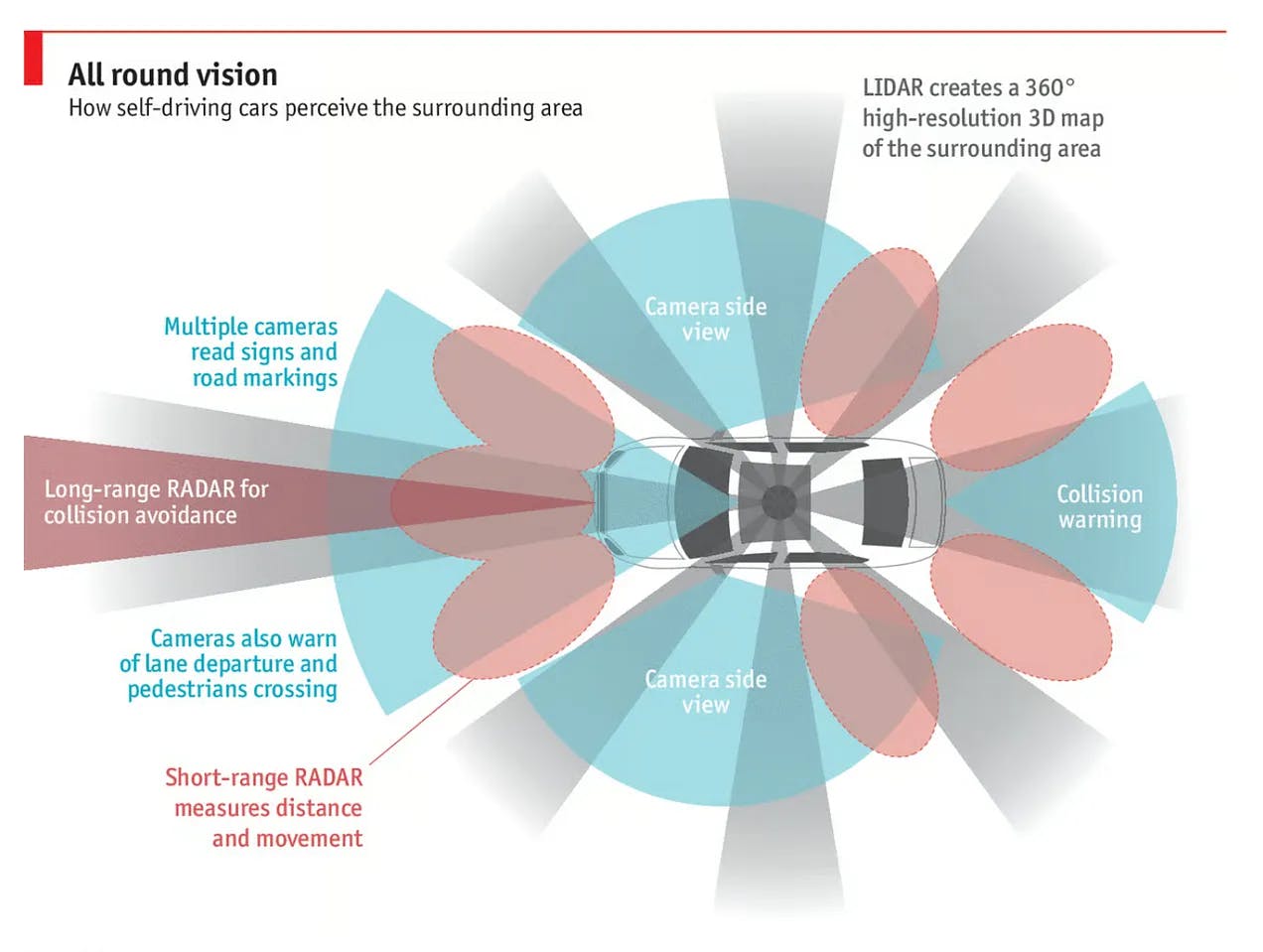 Lidar: Send laser pulses in all directions to create a constantly updating 3D map of surroundings based on the delay between emitted pulses and their registered reflections. Allows Waymo vehicles to “see” regardless of visibility.