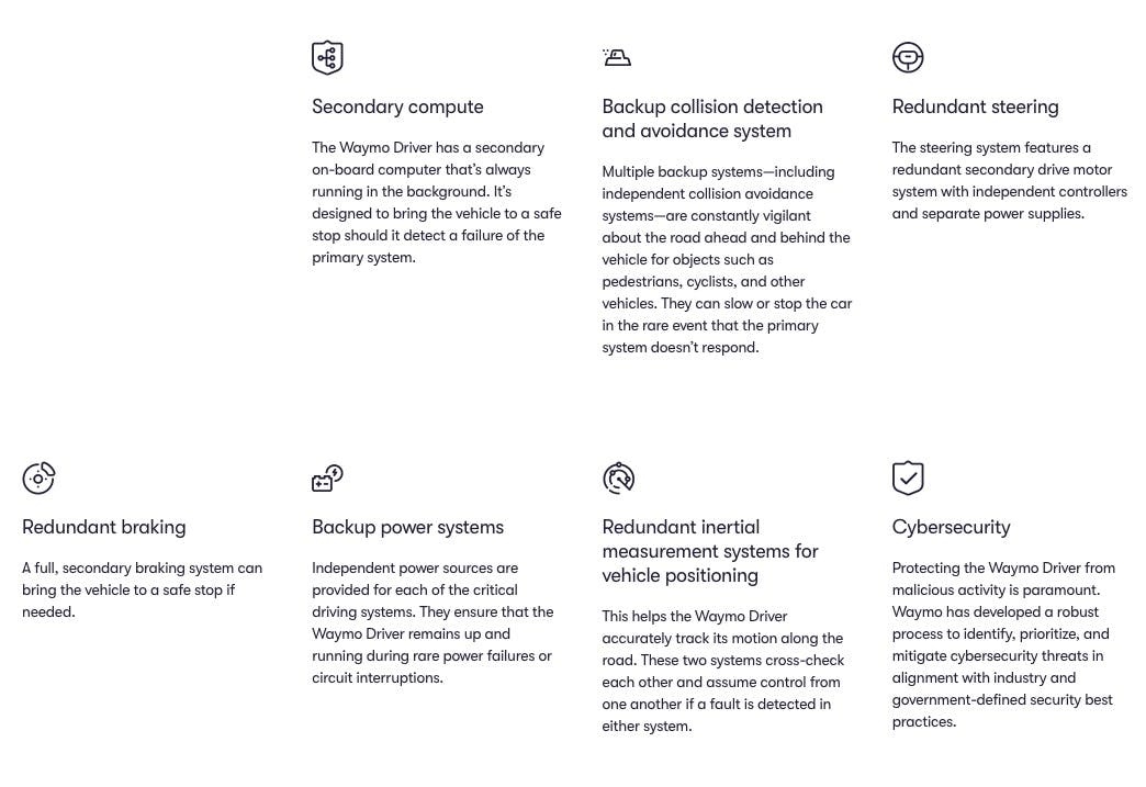 Waymo’s driving hardware is also equipped with redundancies to ensure safety if key mechanical components of the driver or vehicle fail.