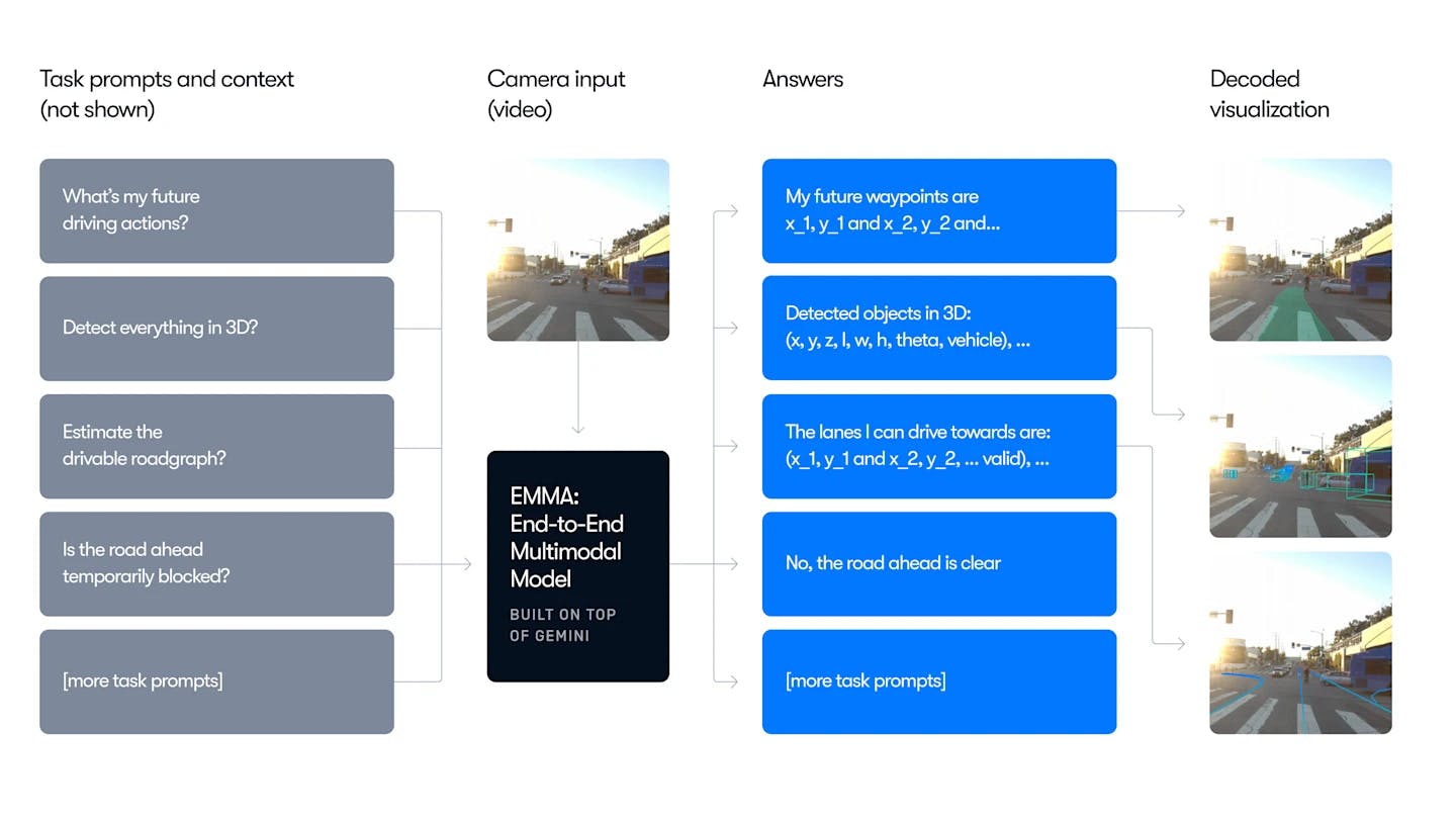 As of June 2025, Waymo’s research team was also exploring an end-to-end multimodal model for autonomous driving, or EMMA. An EMMA uses a multi-modal large language model foundation to map directly from raw camera input to driving-specific outputs, including planner trajectories, perception objects, and road graph elements, which is a departure from the multi-model architecture of the Waymo Foundation Model. In the research paper introducing EMMA, the authors claimed: