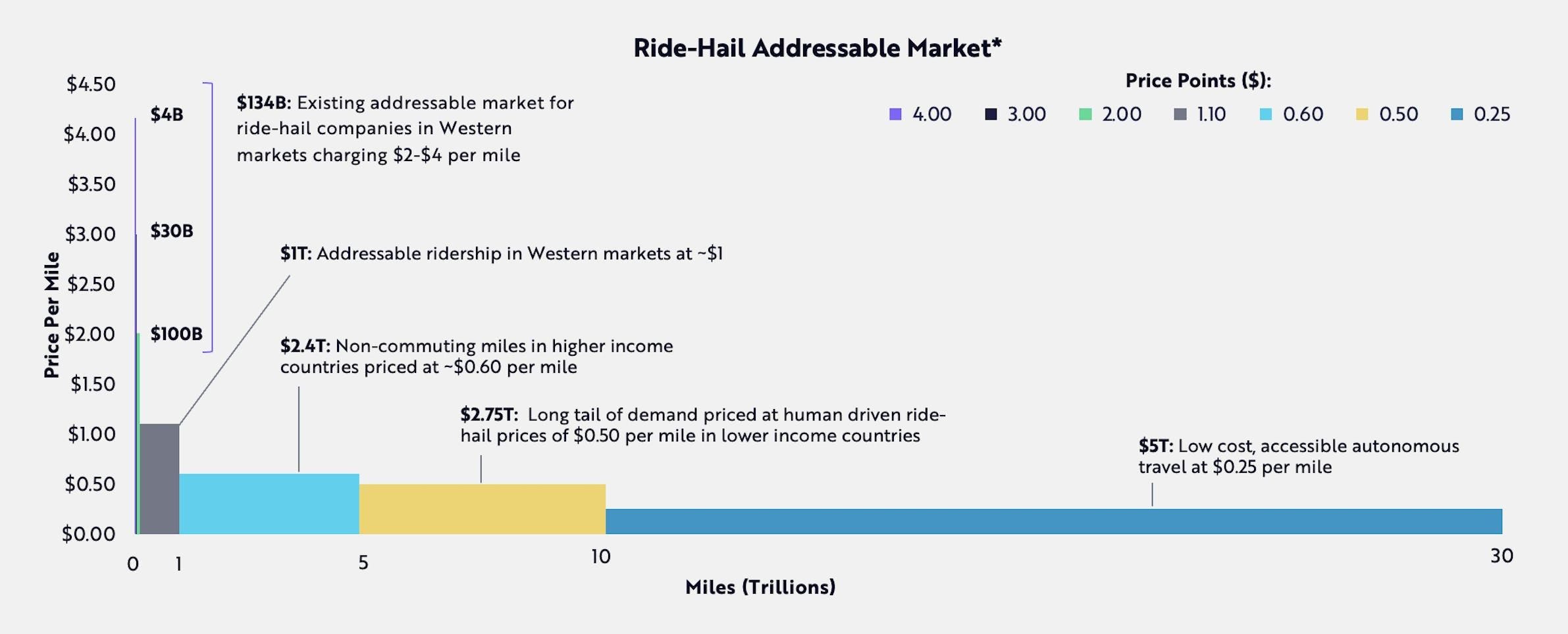 Riders in the US and around the world have increasingly turned to passenger vehicle ride-sharing for transportation, with the global ride-share market size estimated to have grown from $45 billion in 2019 to $107 billion in 2023, and projected to increase to $480 billion by 2032. Proponents of the market opportunity for autonomous ride-sharing point to the falling costs of sensors and EV batteries as drivers. The cost-per-mile of robotaxis could fall to $0.25 by 2035; by comparison, driving a personal vehicle costs an estimated $1.10 per mile as of 2025, and ride-sharing rides cost $2.00 per mile.