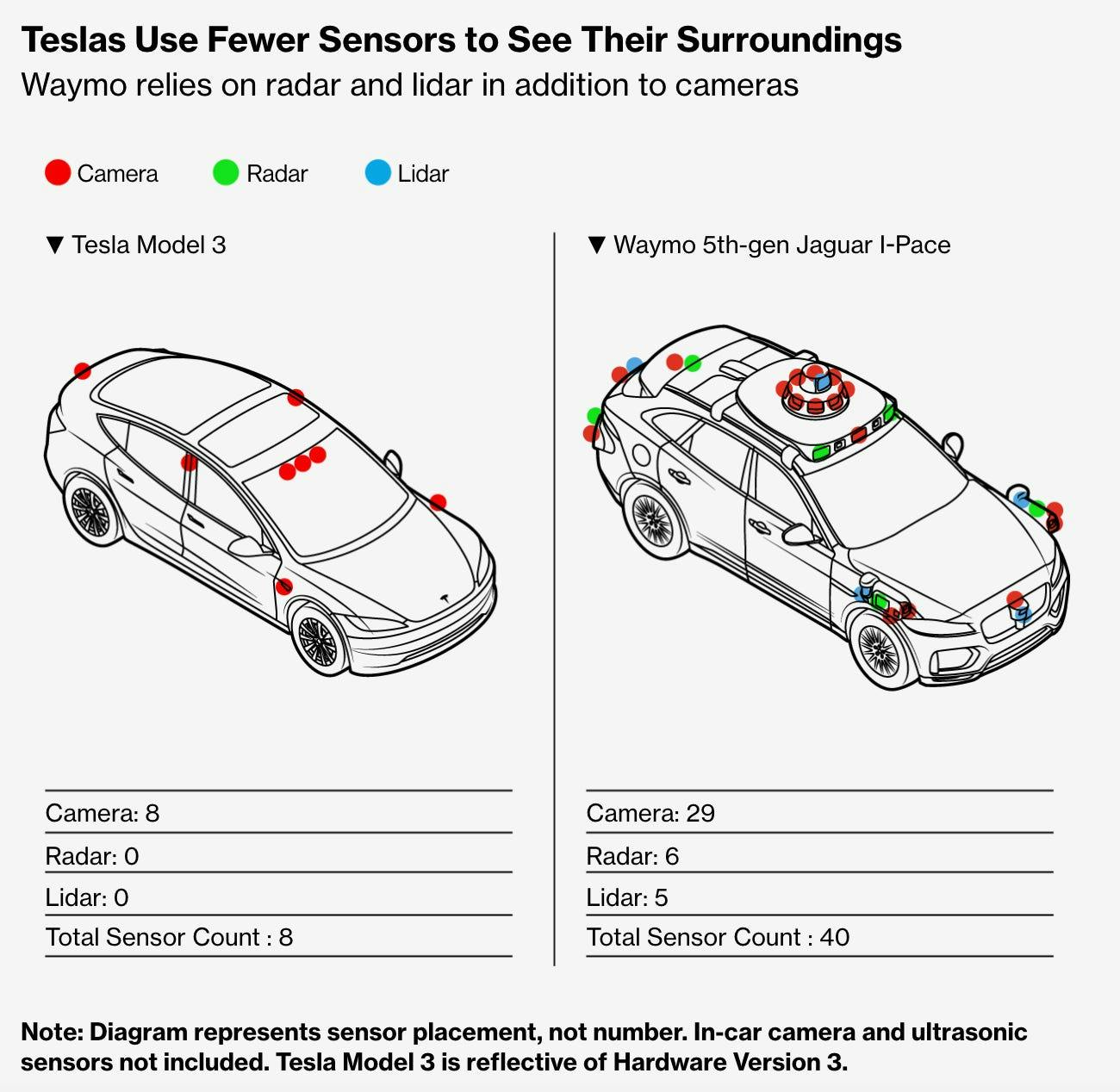 Tesla’s FSD system, both as currently available and as deployed in robotaxis, differs from Waymo’s most notably in its sensor suite and reliance on maps. Tesla AVs do not use radar and lidar systems and instead rely solely on cameras. In 2021, Musk said that he didn’t believe self-driving vehicles required lidar and other active sensors; as Musk put it: “Humans drive with eyes & biological neural nets, so makes sense that cameras and silicon neural nets are only way to achieve generalized solution to self-driving.”