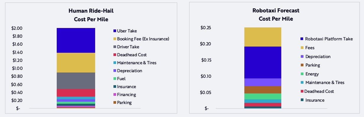 “It starts to become a very big deal if they can crack 30 trips/vehicle/day. The economics become potentially compelling even at a relatively high vehicle BoM cost (inclusive of sensors and compute). Without knowing the actual unit economics, my rough internal math suggests that @ 30 trips per day and $125-150,000 all-in vehicle cost, it's plausible they could recoup the upfront investment on the vehicle in 1 year. This is after deducting various operating costs to run the service (tele-operations, customer support, maintenance/repair, charging/electricity, etc).”