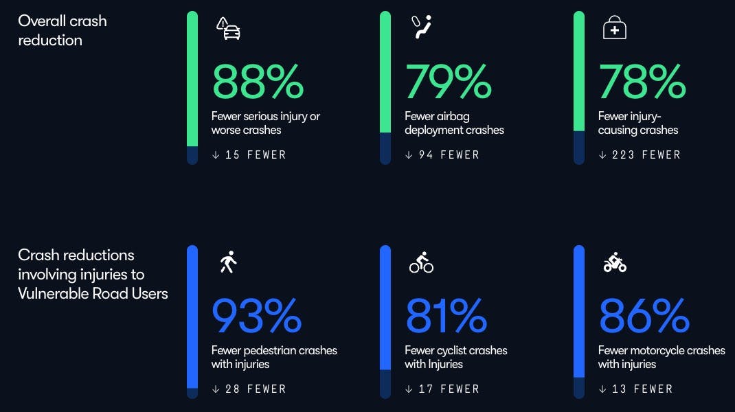 Waymo has published rider-only (RO) vehicle safety statistics relative to human drivers in the same cities where it operates. This data was compiled in a study by Swiss Re, a global reinsurer. Waymo reportedly has a safety record that is better than average human drivers across all metrics incorporated in the study. Waymo has set up a safety hub that includes data for each city in which it operates, and has published the results of its studies on AV safety, including work on collision avoidance and response time.