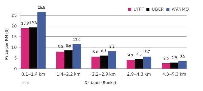 This study found that Waymo prices were more expensive across times of day/month where competition due to human driver availability might vary and locations where some routes might be easier for a human versus the Waymo Driver or vice versa, with the gap being largest for the shortest trips. The study found the largest price differences during rush hour, between 5:00 and 6:00 pm, when demand for rides is highest, and the smallest price differences around 5:00 am, though these differences are more consistent on a geometric basis, given higher prices at rush hour.