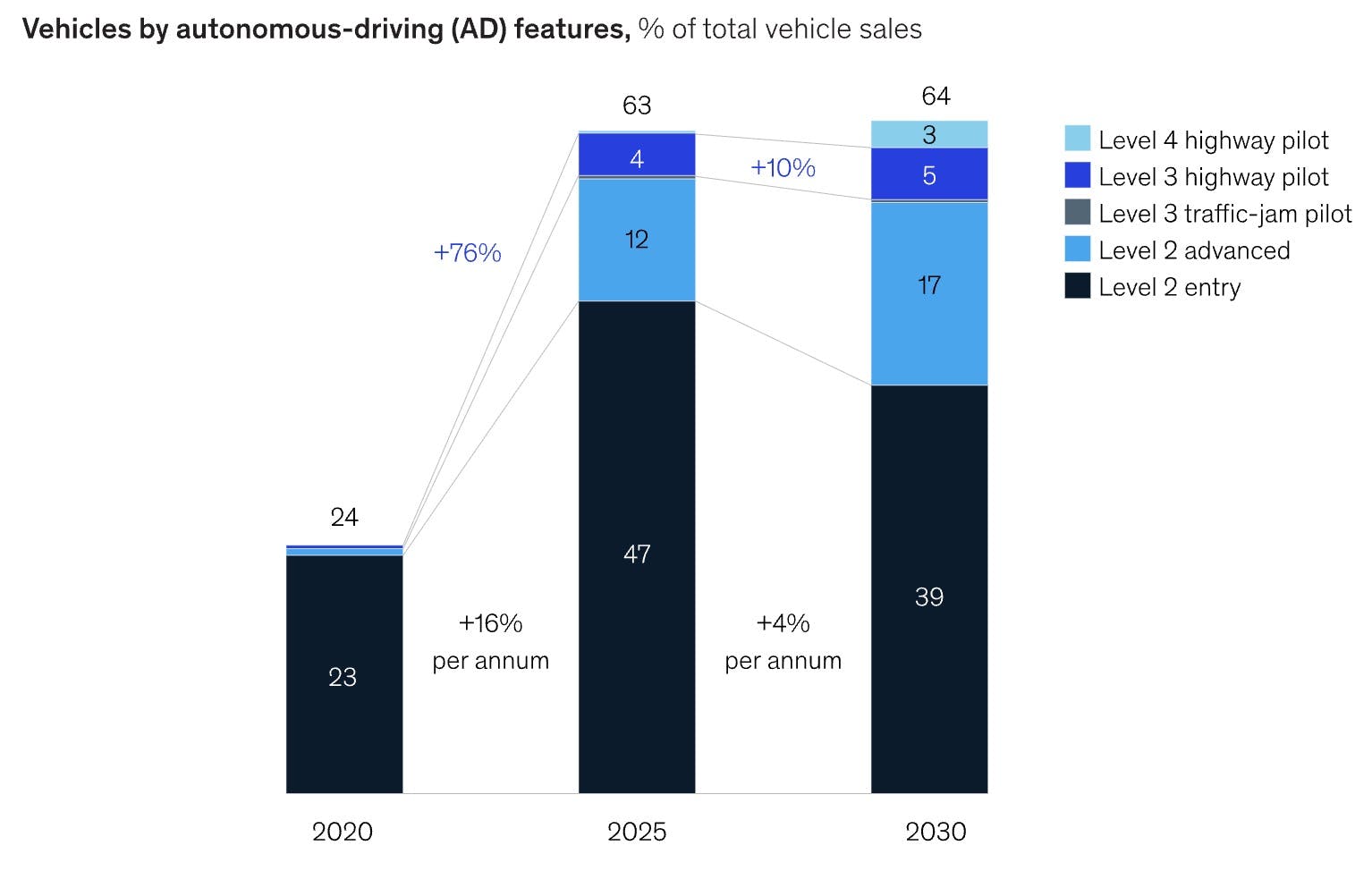 One McKinsey survey of drivers in Europe, the US, and China found 60% of drivers would switch vehicle brands for better assisted driving features, and predicted Level 3 and 4 autonomous vehicles making up a non-negligible share of overall new car sales by 2030.