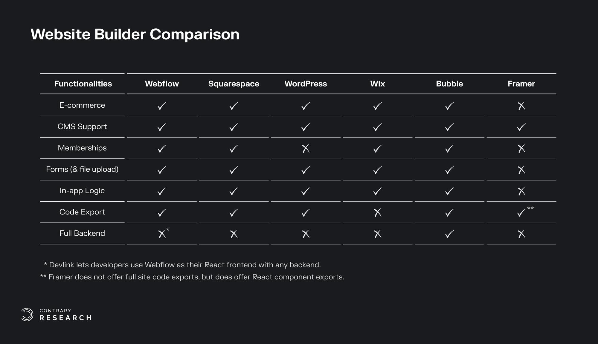 Wix: Founded in 2006, Wix is a drag-and-drop website builder for ecommerce, businesses, and individuals. As of October 2023, Wix had a market cap of $4.9 billion. Unlike Webflow, Wix is template-first and completely hides CSS styling by default. The lack of a direct CSS interface forces Wix users into more rigid designs, while Webflow favors a more modular, component-style process. To give customers more control, Wix released Editor X in February 2020, mimicking Webflow’s advanced controls more similarly. Even though Wix’s default editor is less robust than Webflow’s, Wix matches Webflow’s functionality closely since it also offers memberships, ecommerce, and CMS support. Similar to Squarespace, Wix targets business owners and individuals directly, while Webflow seems to be more designer and agency-oriented.