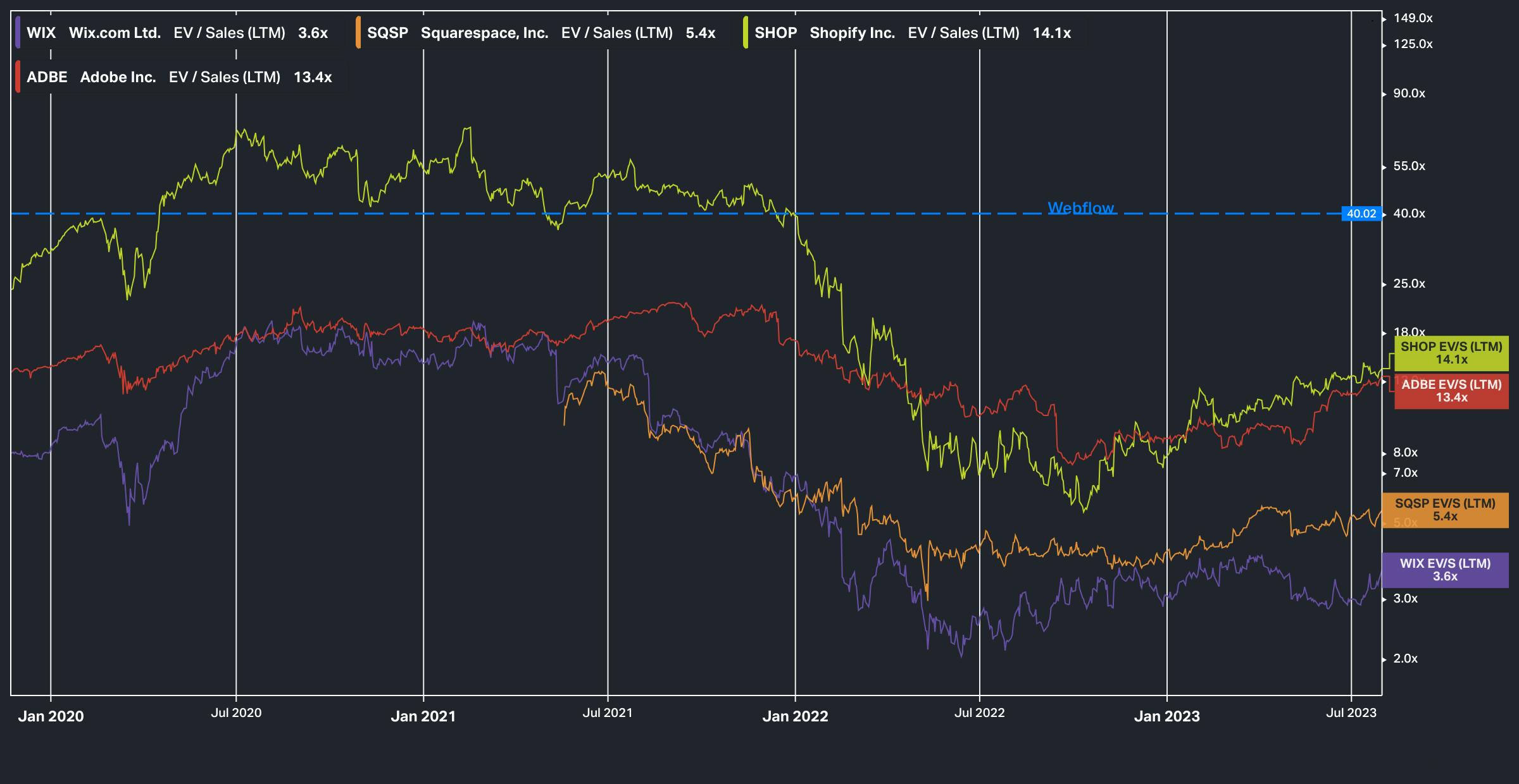 Webflow’s 2022 valuation of $4 billion, at a point in time when the company was generating ~$100 million ARR, represents a 40x revenue multiple. In the public markets, comparable companies like Wix ($1.3 billion in revenue in 2022), Shopify ($5.6 billion in revenue in 2022), Squarespace ($867 million in revenue in 2022) and Adobe ($17.6 billion in revenue in 2022) are trading at ~3-14x revenue.