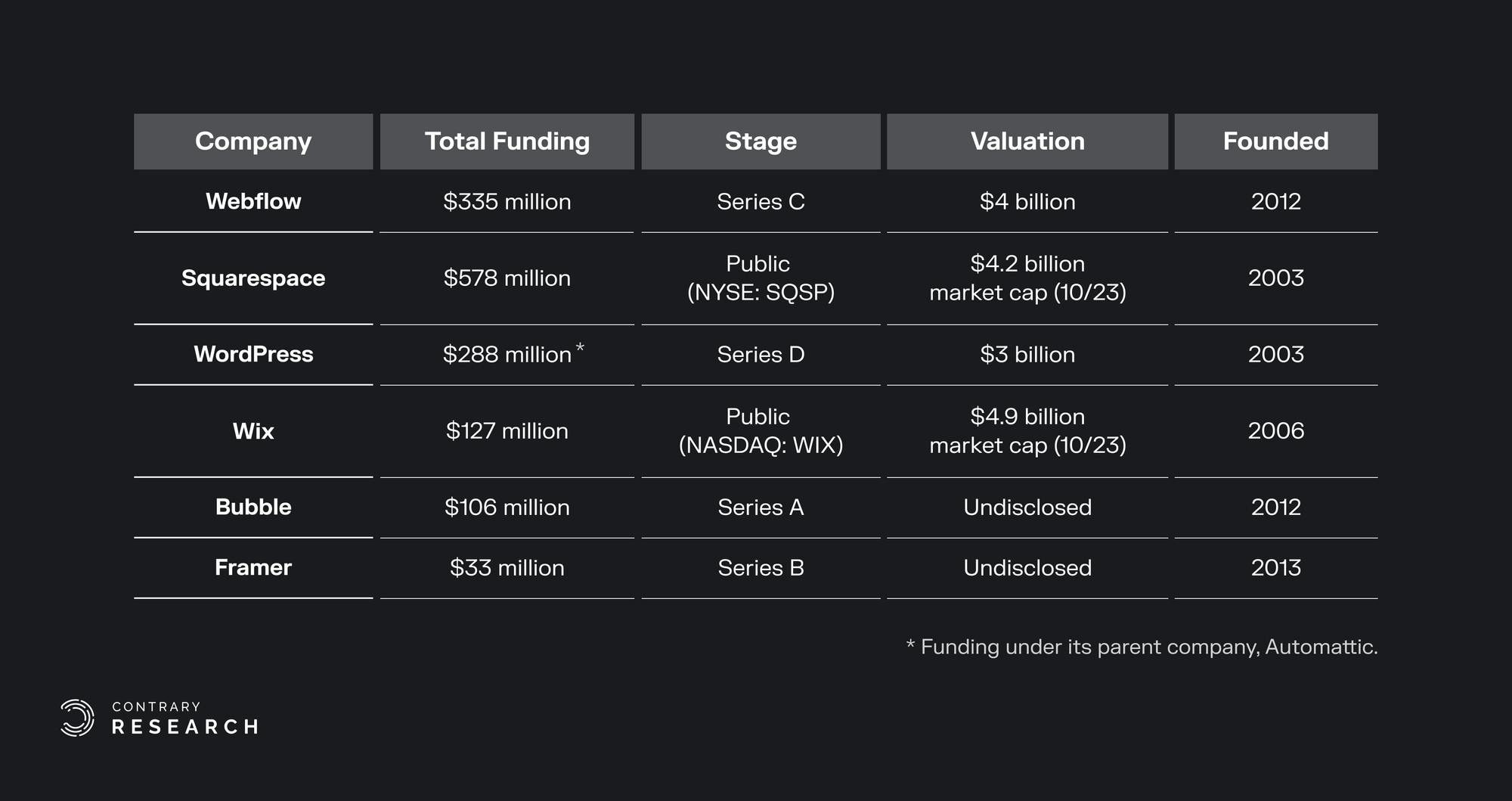 Squarespace: Founded in 2003, Squarespace offers template-first websites for small businesses and individuals for ecommerce and blog sites. The company went public in May 2021 and had a market cap of $4.2 billion as of August 2023. One point of difference between Squarespace and Webflow is their target audience and user interface. Squarespace is primarily aimed at small business owners without design or web development skills, thus choosing to offer a more templated and simplified building experience. Webflow’s more complex interface allows for complex animations, functions, and integrations, which is ideal for professional designers.