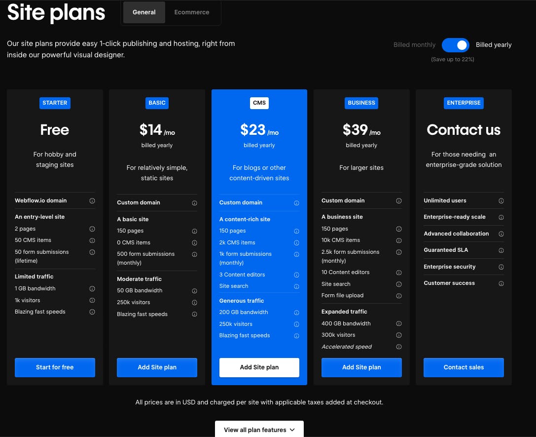 The Site plans vary depending on whether the plan is for General use or Ecommerce use. For General use, the free tier limits the number of records in the CMS database, the number of form submissions, and bandwidth, and prevents the ability for users to add their own custom domain. The Basic plan is $18 per month or $168 annually. Their most popular CMS plan is $29 per month or $276 annually. The Business plan is $49 per month or $468 annually. More customization and security options are available on the Enterprise plan.