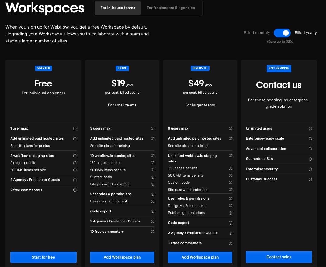 Although Webflow’s Enterprise pricing is not disclosed, for comparison, WordPress’s Enterprise plan starts at $25K/year. Both Webflow and WordPress’s enterprise plans offer advanced team controls, robust CMS collections, and specific bandwidth and security.