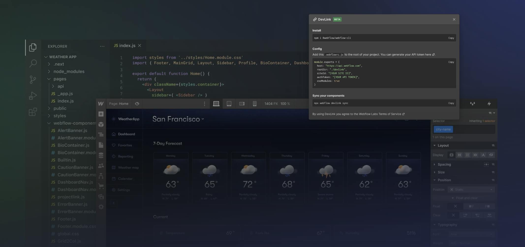 Although Webflow was initially launched to help customers build marketing and content pages, some customers want to take their sites a step further. DevLink helps customers use Webflow as their React frontend and traditional code as their backend. Customers have already published full-stack weather applications using Webflow. Webflow lists possible use cases that include MVP development, interactive marketing landing pages, and style guides for clients.