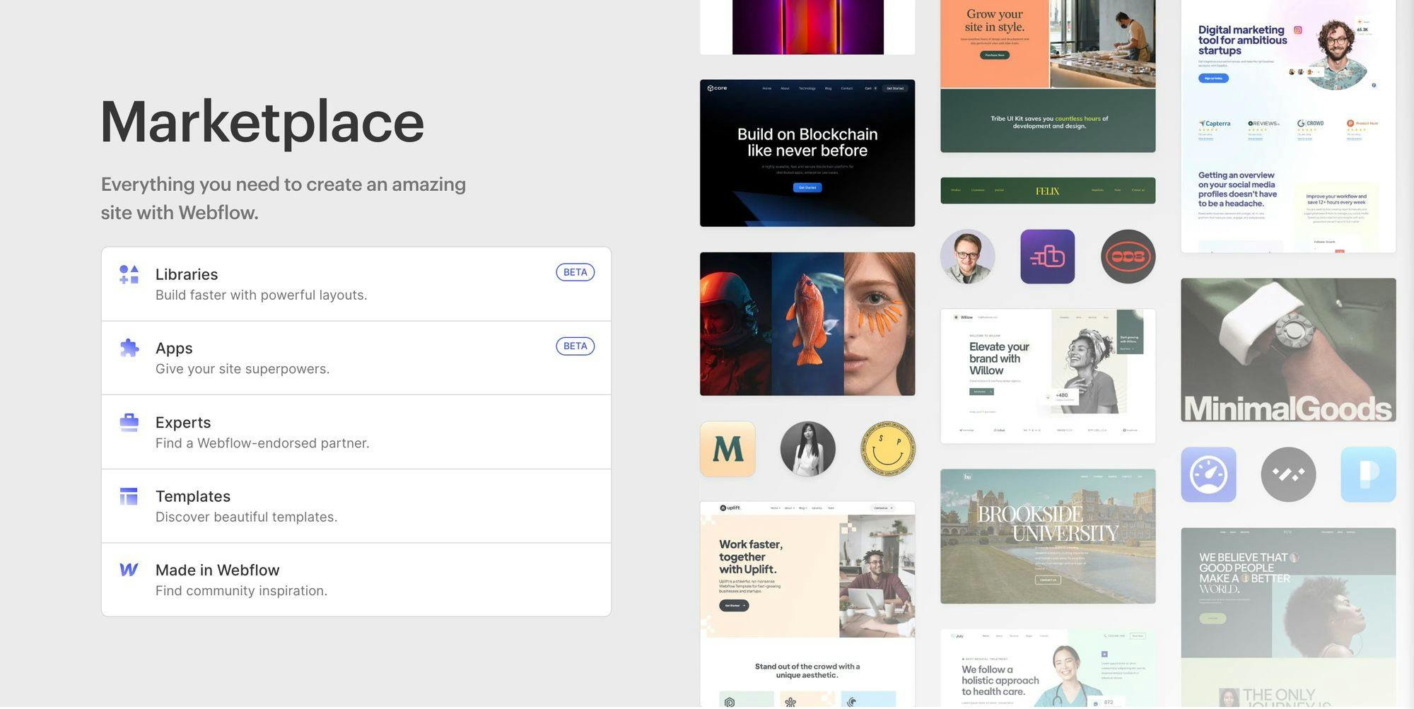 In November 2022, Webflow launched Webflow Marketplace, a central hub for products and services to quickly create and run Webflow sites. This product feature offers Webflow creators the ability to promote their work and share and sell templates, apps, and layouts.