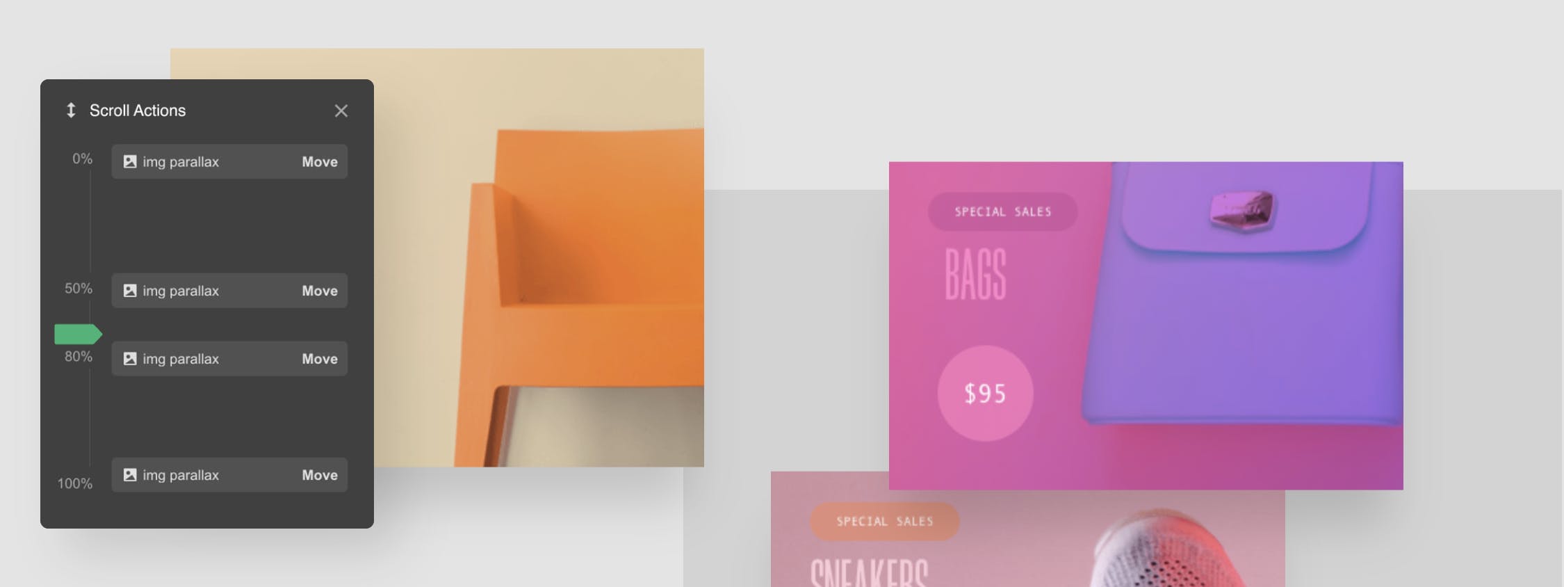 Webflow offers a visual interaction tool to allow designers to build animations without code. Designers can use this tool to create parallax animations, precise reveal animations, progress bars, and other options. Element sizes, styling, and position on a page can be determined based on a site visitor's scroll progress over either a specific element or the entire page, and multi-step animations can also be built.