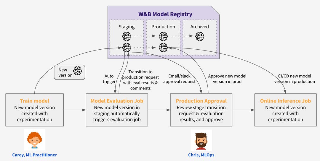 W&B offers a “model registry and lifecycle management” product that enables users to collaborate and track model versions across thousands of projects, millions of experiments, and hundreds of team members. It seeks to be a central place from which one can “manage all model versions through every lifecycle stage, from development to staging to production.“