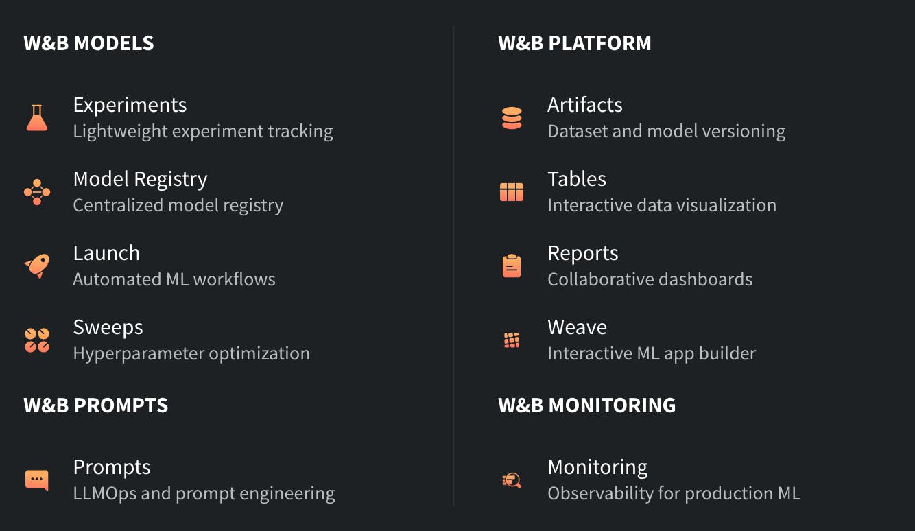 W&B seeks to be an end-to-end solution for machine learning (ML) projects, streamlining the entire process from development to deployment. The platform extends across (1) experiment tracking (logging any change to any model), (2) visualization (allowing users to better understand model behavior and performance), (3) collaboration, (4) hyperparameter optimization, (5) comparing between models, (6) model deployment and monitoring, (7) facilitating the building of ML and data apps, and more. In April 2023, W&B launched a new product targeted at LLM-specific workflows, often called LLMOps.