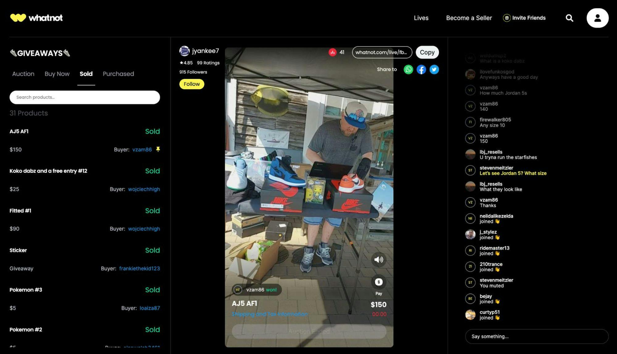 Whatnot says it provides a “dedicated support staff” for sellers in order to facilitate customer support. After sellers are approved by Whatnot to join the platform, they can start a live stream where they can chat and interact with their live audience. Sellers set a starting price and time limit for the item they’re selling, which can be sold via auction to the highest bidder or can also be sold via a set price with a “Buy it Now” call to action. Sellers can also access a giveaway feature to help attract an audience.