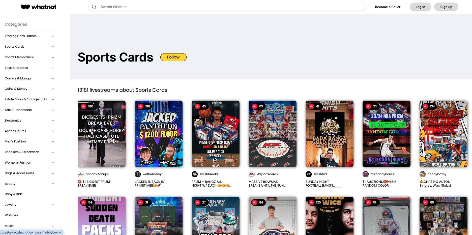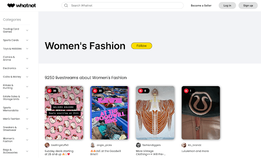 Whatnot has a wide and growing variety of categories of resale products, including trading cards, clothing, and collectibles. All categories of seller streams can be accessed through the main app interface or the desktop website as a buyer/viewer. In contrast, sellers/influencers must submit an application before they can start hosting a stream.