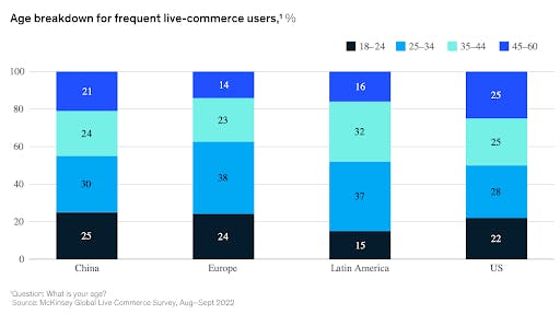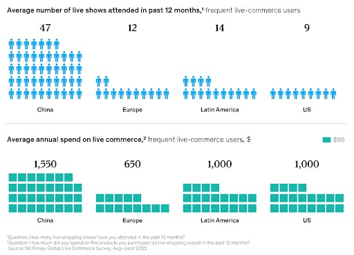 This trajectory could soon be paralleled in the US, where livestream shopping has not yet reached the same mainstream adoption as in China. Livestream shopping accounted for $20 billion in revenue in the US in 2022, while ecommerce sales as a whole were $7.1 trillion in the same year, meaning that livestream shopping accounted for just 2% of US retail ecommerce and 0.3% of total retail sales that year.