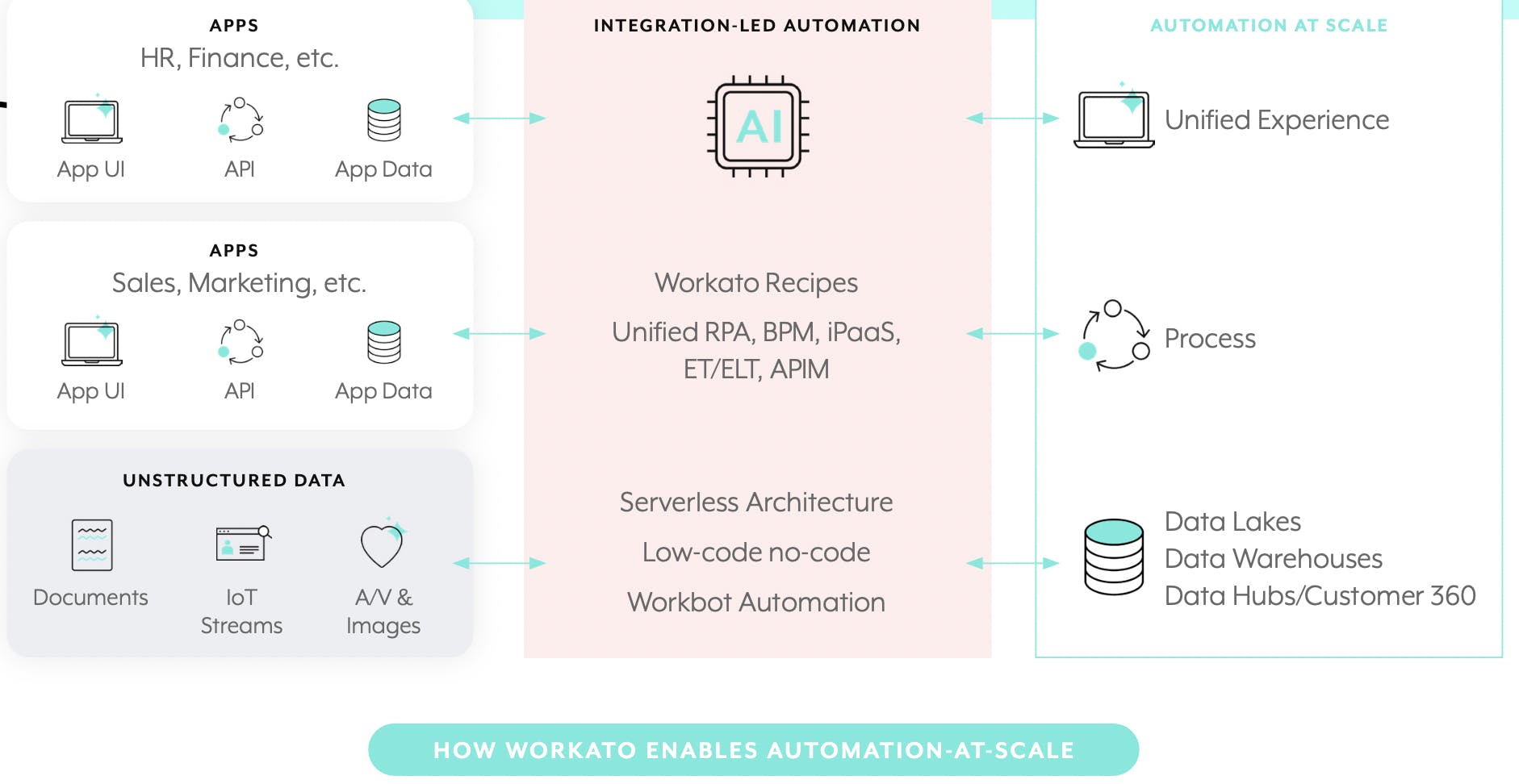 Workato positions itself in this expanding market with a unified platform, empowering both business and IT users to build automation into their applications. The company offers over 1K pre-built connectors across major SaaS tools, including Salesforce, Workday, and Slack. Workato's cloud-native architecture enables scalability, real-time automation, and event-driven integration capabilities. This technical foundation supports both horizontal use cases across business functions (marketing, sales, HR) and vertical industry-specific solutions for healthcare, finance, logistics, and other sectors.