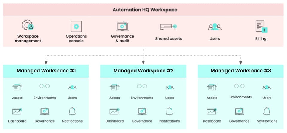 Projects within Workato's platform revolve around Workato Workspaces, which serve as hubs for users to access and oversee their integration processes. Automation HQ provides centralized control and oversight across all workspaces, ensuring seamless administration, monitoring, and governance.