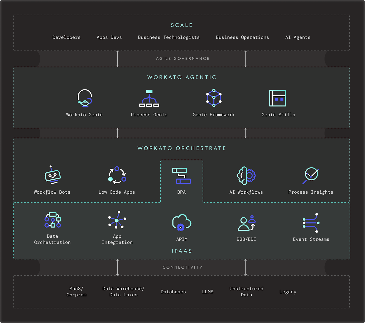 Workato’s product ecosystem is structured around three core pillars: Platform, Orchestration, and Generative AI. Each of these work together to automate business processes at scale.