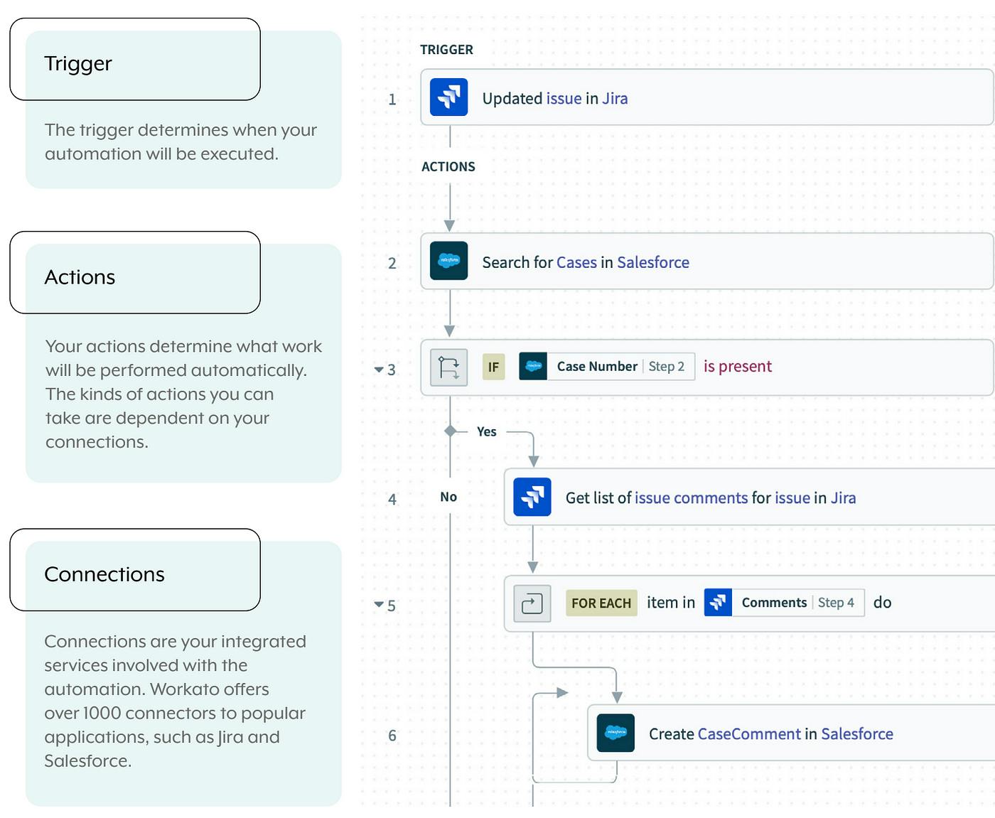 The fundamental building blocks of Workato’s platform are recipes, an automated workflow that executes a series of steps to integrate and process data across multiple applications. Every recipe includes a trigger that initiates the workflow (events that start the recipe) and one or more actions that execute when a trigger event occurs (tasks performed in response to triggers). Recipes use connectors to interact with different apps, ensuring seamless data flow across systems.