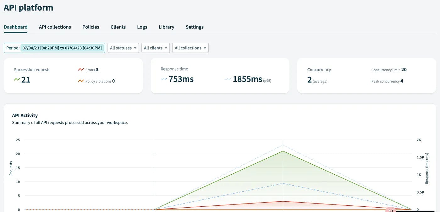 Monitoring and optimization are integrated into the platform via a real-time analytics dashboard. Users can track API health, performance, and security posture, with logging tools to isolate and resolve issues quickly. This provides operational visibility across the entire API lifecycle, helping teams maintain compliance and reliability standards.