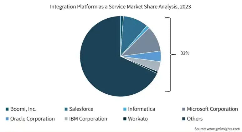The vendors, Salesforce (MuleSoft), Oracle, Informatica, SAP, and Boomi, accounted for a 57.7% share in 2023, contributing approximately 66% to the net dollar inflow of the overall iPaaS segment.