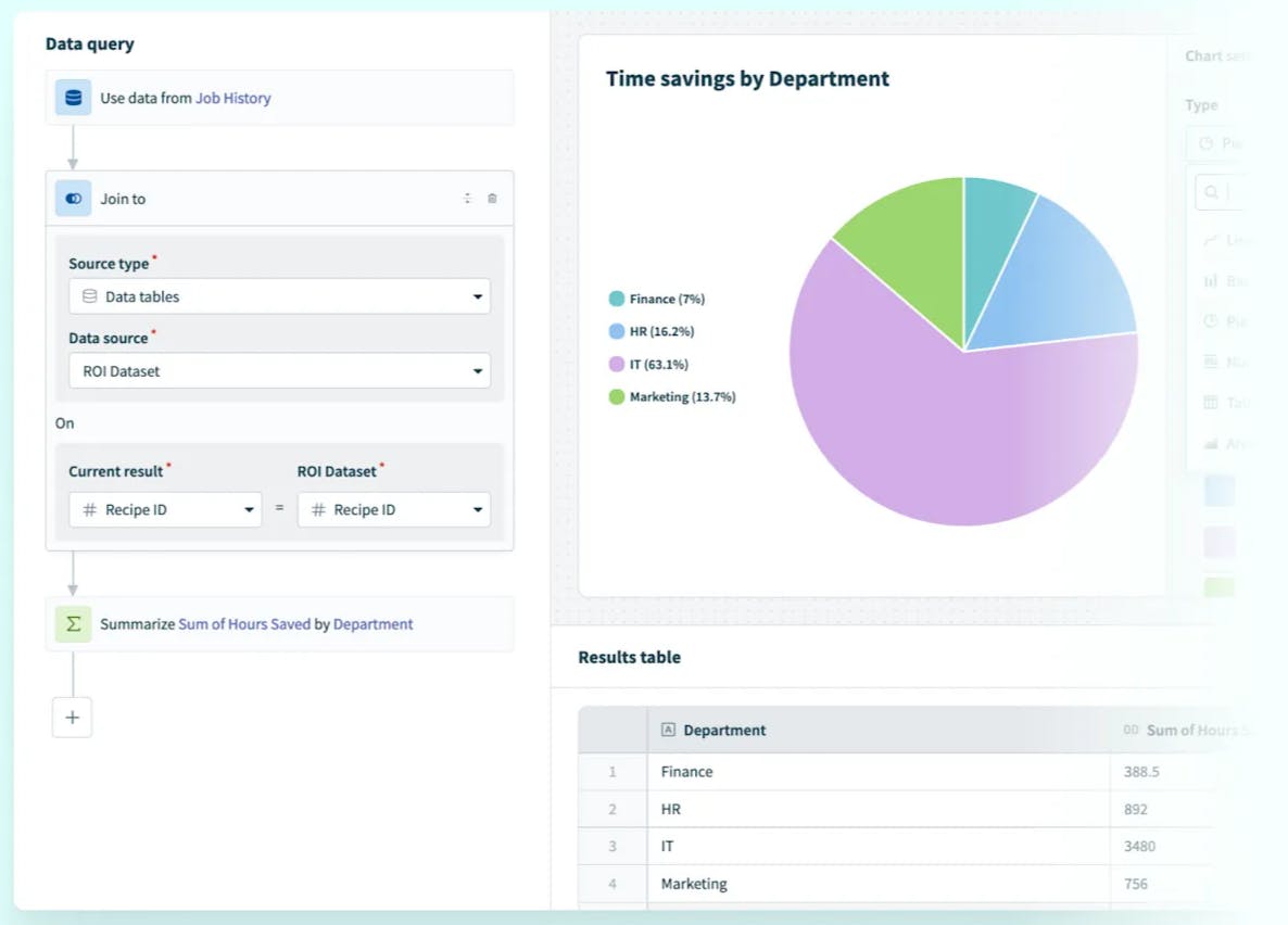 Workato’s Process Insights platform provides tools to measure, visualize, and optimize the performance of automated workflows. The insights field provides insights and statistics on recipe executions ("jobs"), allowing users to view details and logs and re-run jobs as needed. It also displays plan usage information. Users can create custom dashboards and reports to monitor key performance indicators (KPIs) such as cost savings, time savings, and revenue impact. By leveraging job history and real-time data from automations, teams can analyze operational performance and track return on investment (ROI). The platform also supports custom metric definitions, enabling organizations to tailor insights to their specific business goals.
