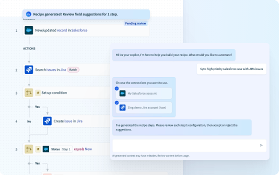 Workato’s Copilots are AI-powered assistants designed to simplify the process of building, editing, and optimizing automation workflows, known as recipes, using natural language. Leveraging insights from millions of prior recipes, Copilots help users generate entire automations by describing a desired workflow in plain terms. For example, a user can request a recipe that sends high-priority tickets from Salesforce to JIRA, and the Recipe Copilot will build the corresponding automation, including triggers, actions, and data mappings. Additional Copilots assist with adding steps, mapping data fields, writing formulas, and generating recipe descriptions.