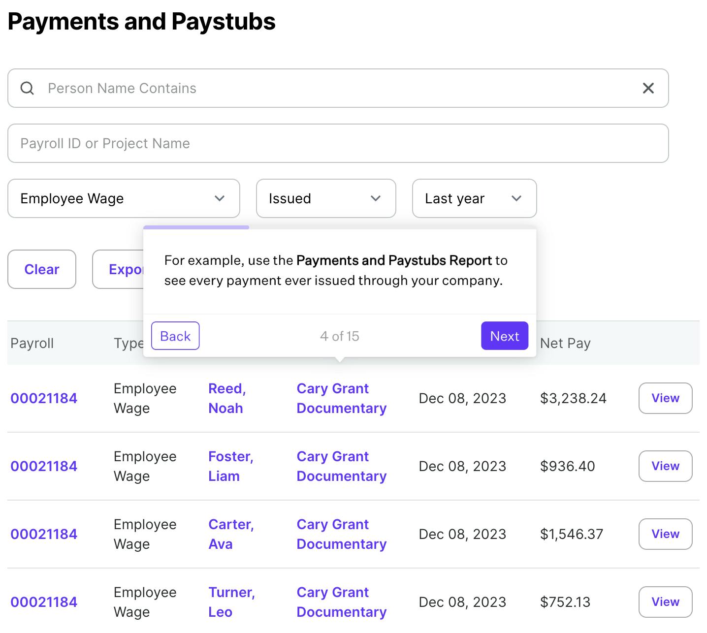 Expansive list of default reports: Wrapbook provides all customers with detailed reports on past payroll, past payments, past team requests, tax documents, hiring demographics, and more.