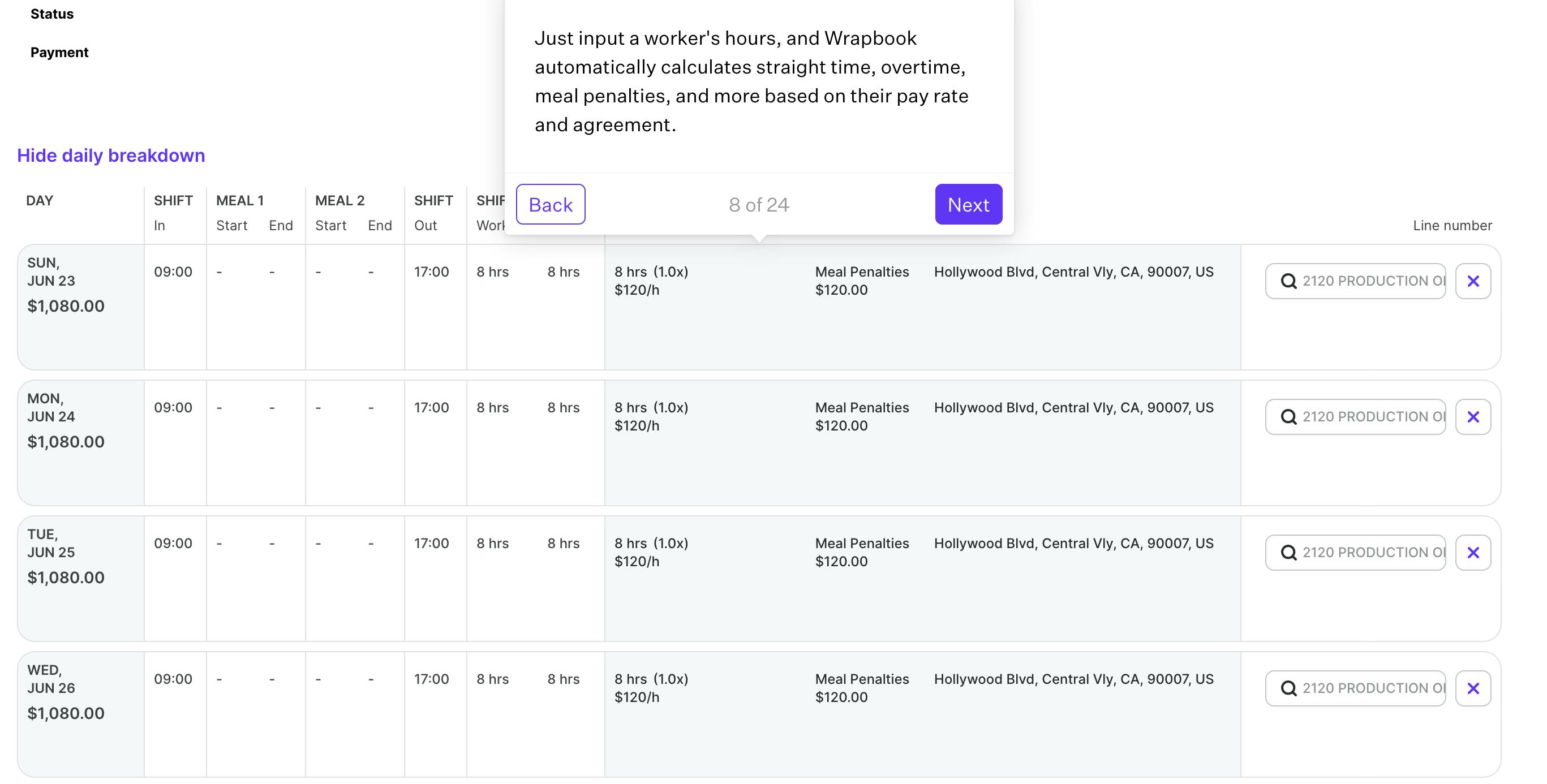 Automated hour-to-gross time card calculations: Once workers have added their hours, Wrapbook automatically calculates wages for union and non-union workers alike, accounting for straight time, overtime, and meal penalties based on their pay rate and contracts.