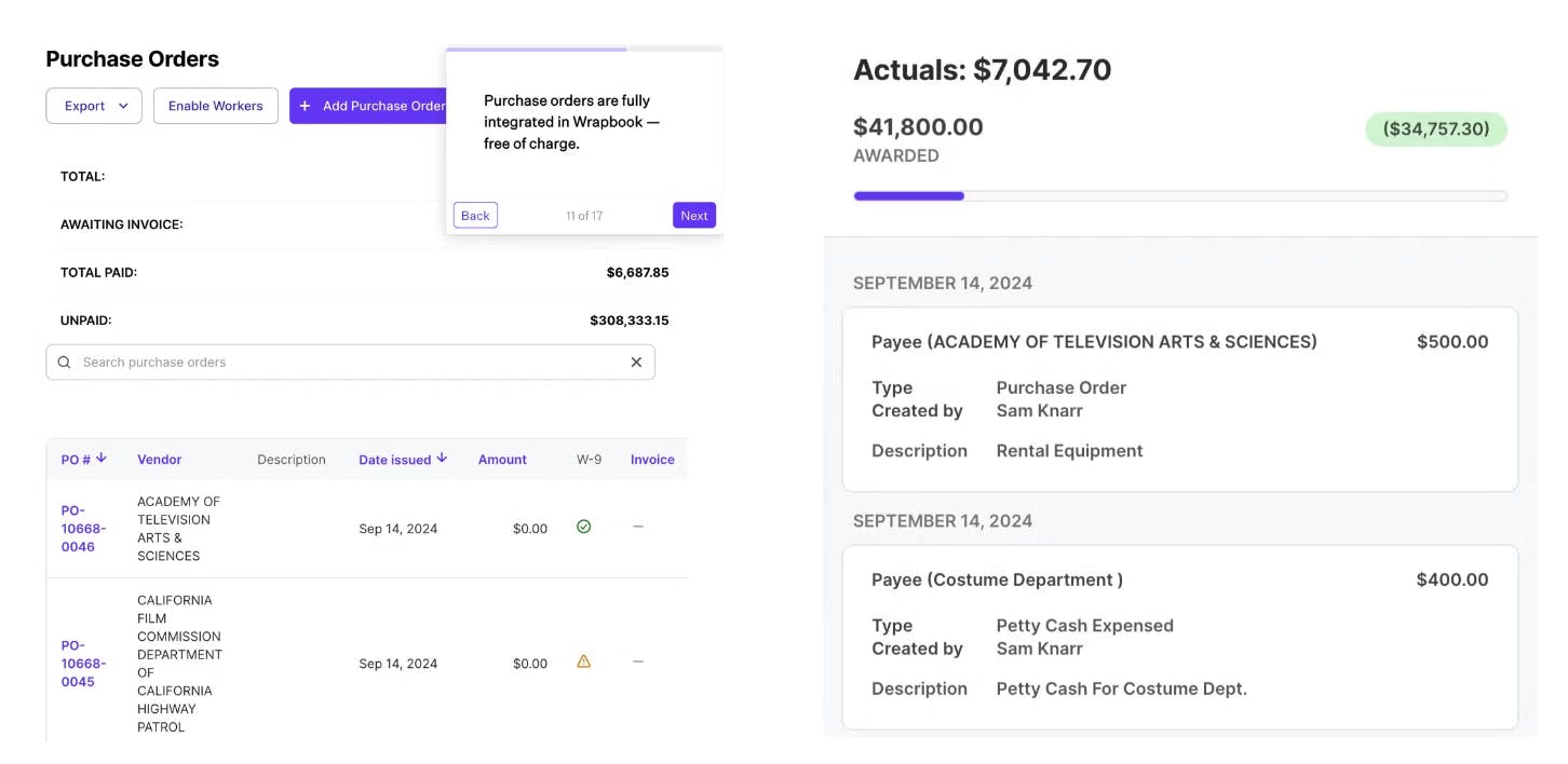 Wrapbook’s cost-tracking solution syncs time cards, expenses, purchase orders, and petty cash to customers’ budgets in real time, eliminating the need to rekey data or incorporate 3rd party expense management software. Key features include: