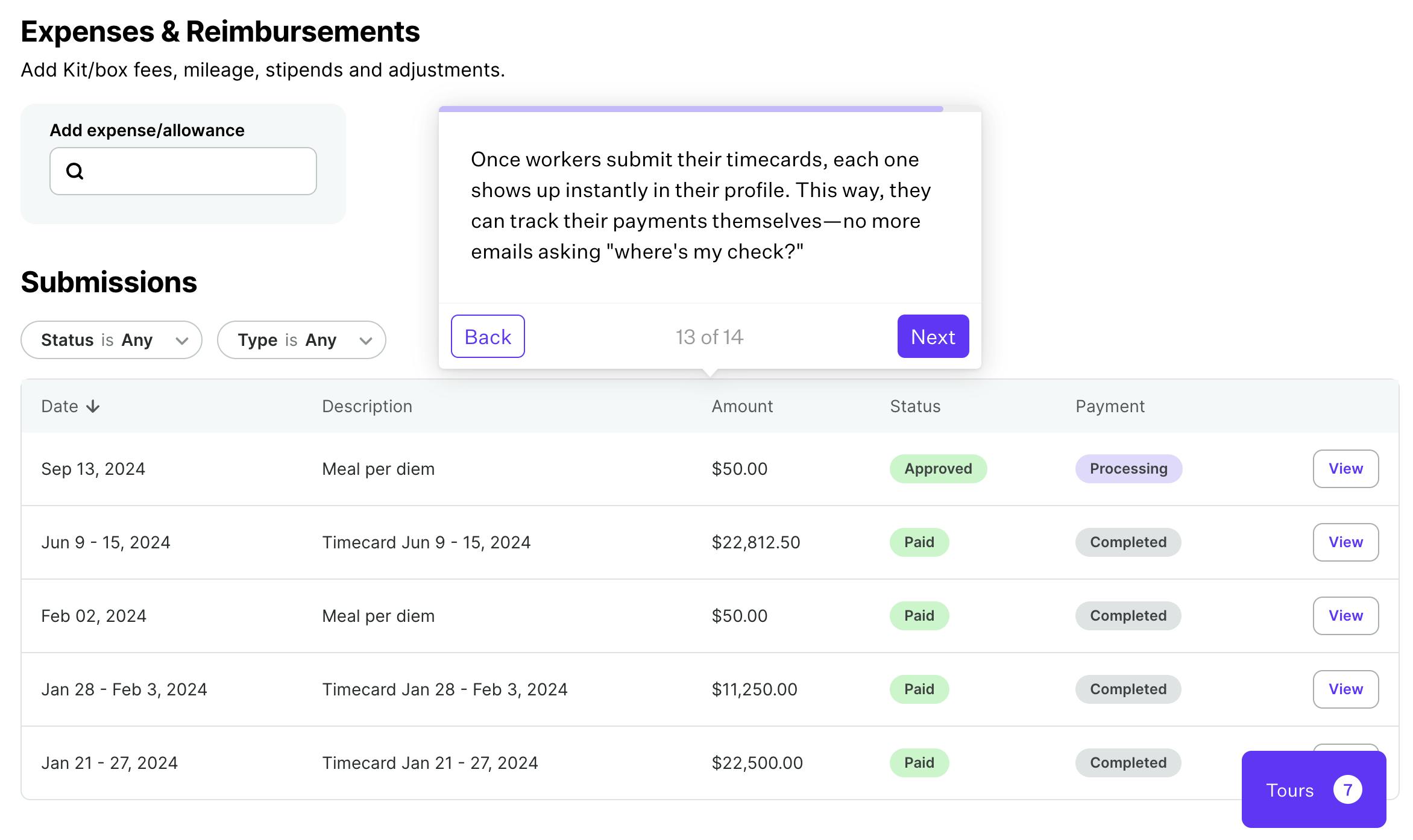 Intuitive worker experience: Once workers receive an email to join Wrapbook, they only have to add their federal and state tax withholding information once, and it stays in Wrapbook’s database indefinitely. Hours and expenses can be submitted through Wrapbook’s mobile app as well.